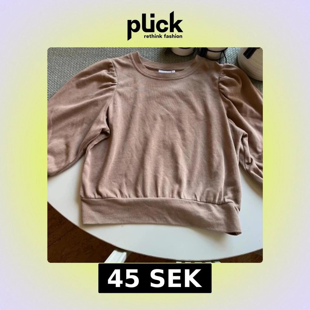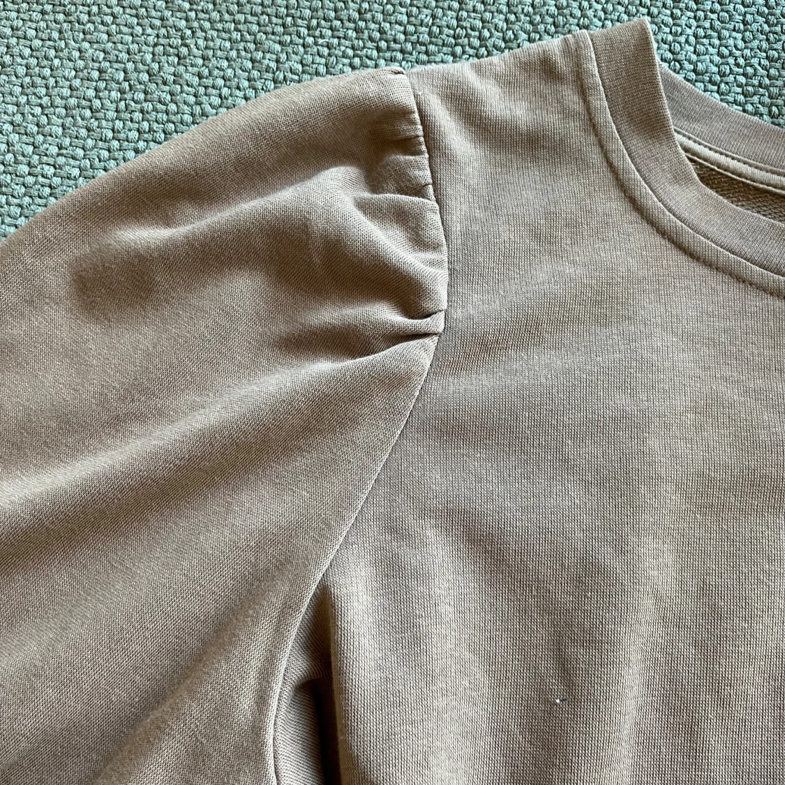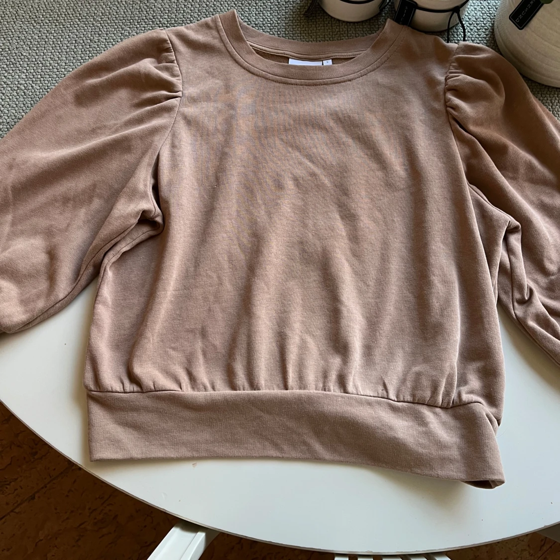 Säljer en stilren beige tröja med puffärmar. Tröjan har en rund halsringning och är tillverkad i ett mjukt material som ger en bekväm passform. Perfekt för en avslappnad look.