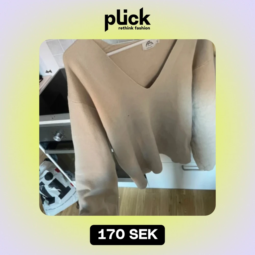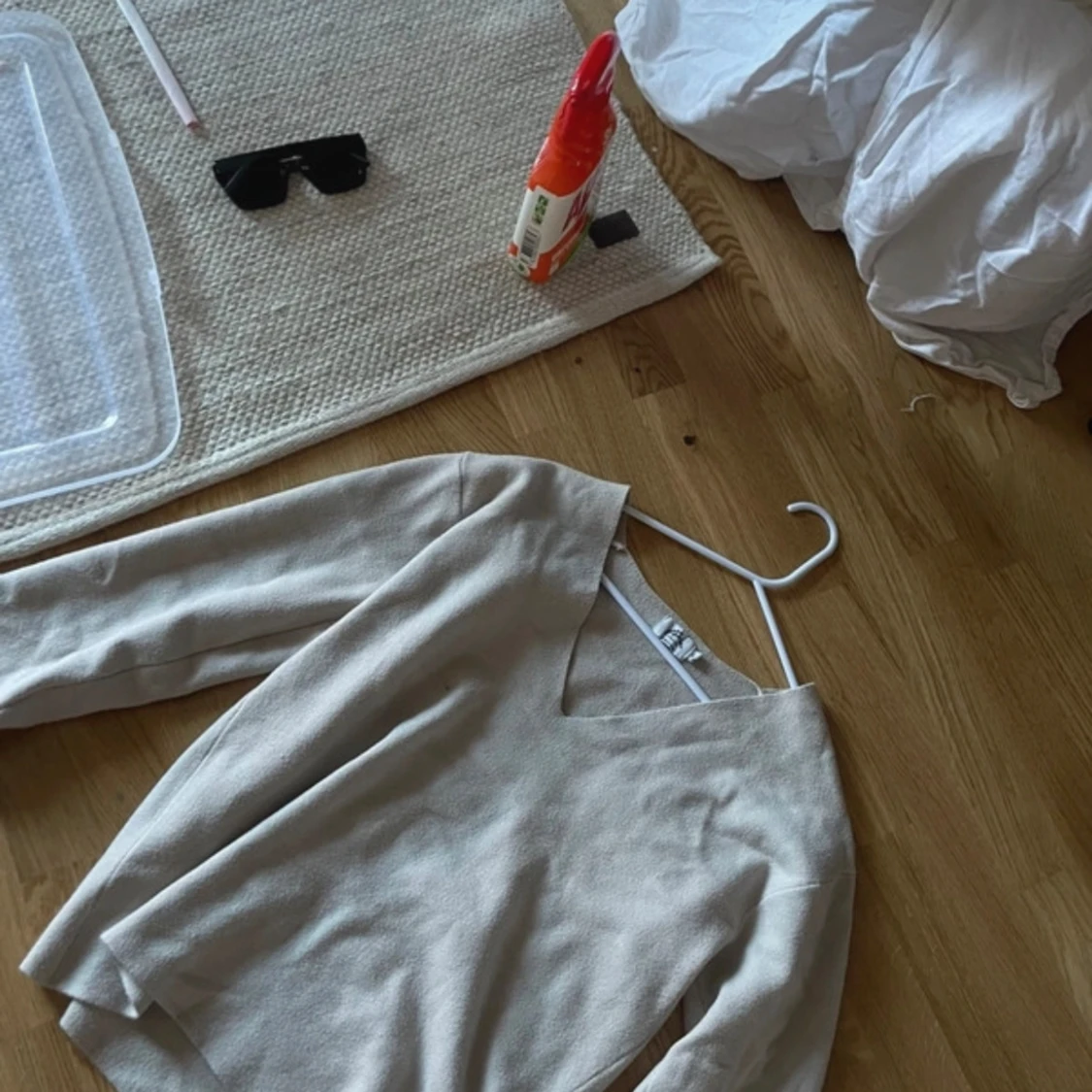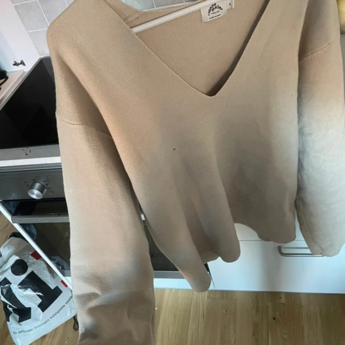 En beige tröja med V-ringning och långa ärmar. Tröjan har en lös passform och är tillverkad i ett mjukt material.