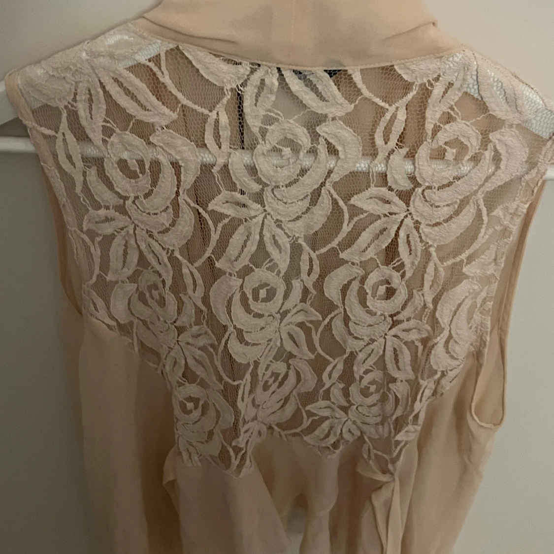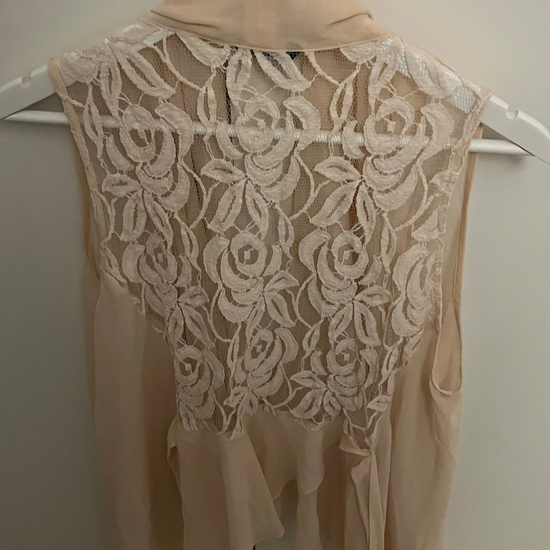 Elegant beige väst med vackra spetsdetaljer på ryggen. Västen har en flödande design och är perfekt för att lägga till en romantisk touch till din outfit.