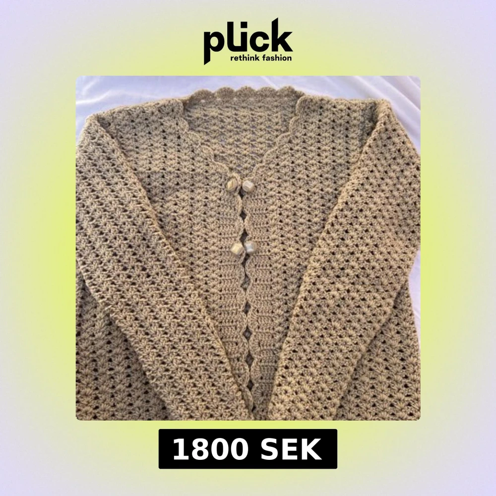Superfin beige virkad kofta med lång ärm och snygga pärlknappar framtill. Koftan har ett unikt virkat mönster och vågig kant längs halsringningen. Perfekt att slänga över en topp för en chill och trendig look.