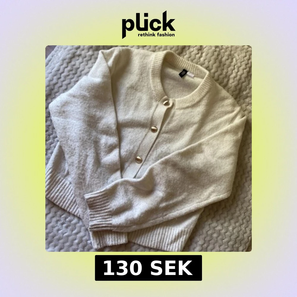 Supermjuk beige kofta från H&M med snygga guldknappar framtill. Rund halsringning, ribbade muddar och långärmad modell. Perfekt för lager-på-lager och ger en clean look till din outfit.