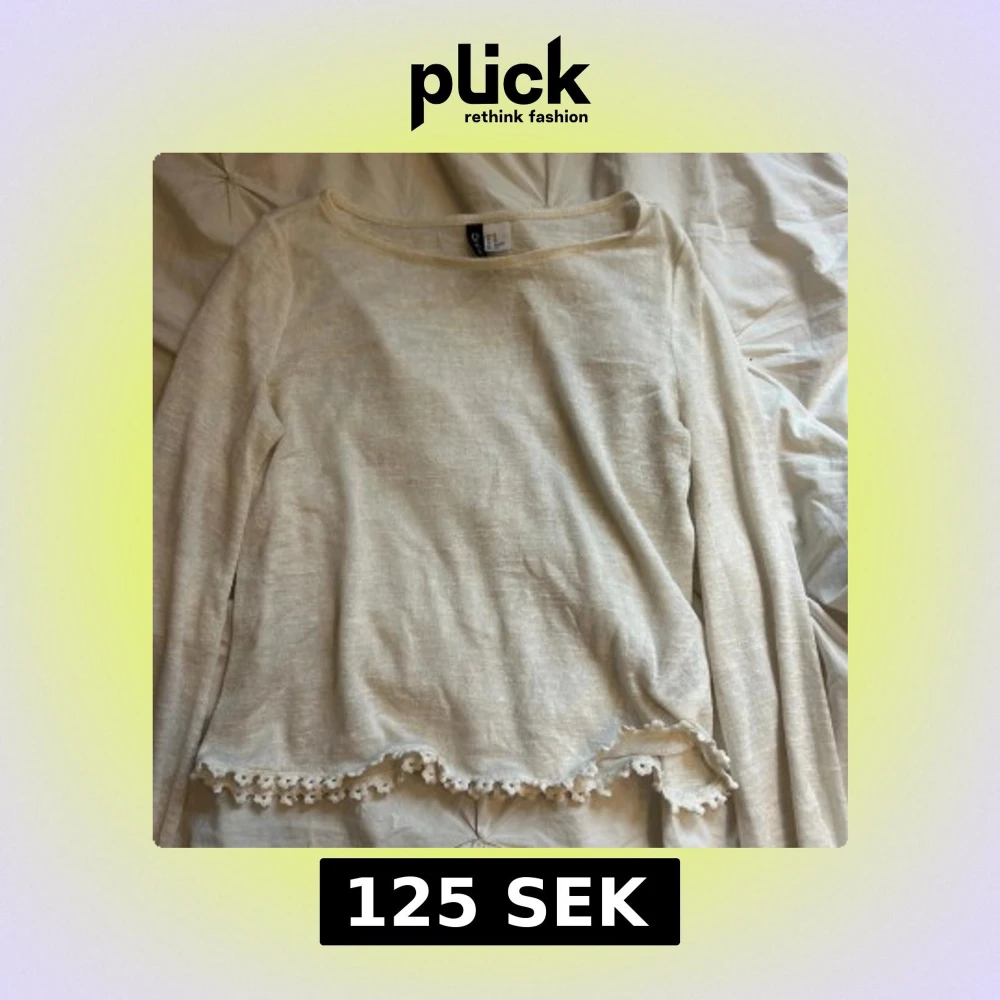 Supersöt beige/vit långärmad topp från hm med rund halsringning och dekorativ spetskant nertill. Tunt och lätt material som passar perfekt till lager-på-lager eller som den är. Enkel att styla med både jeans och kjol.