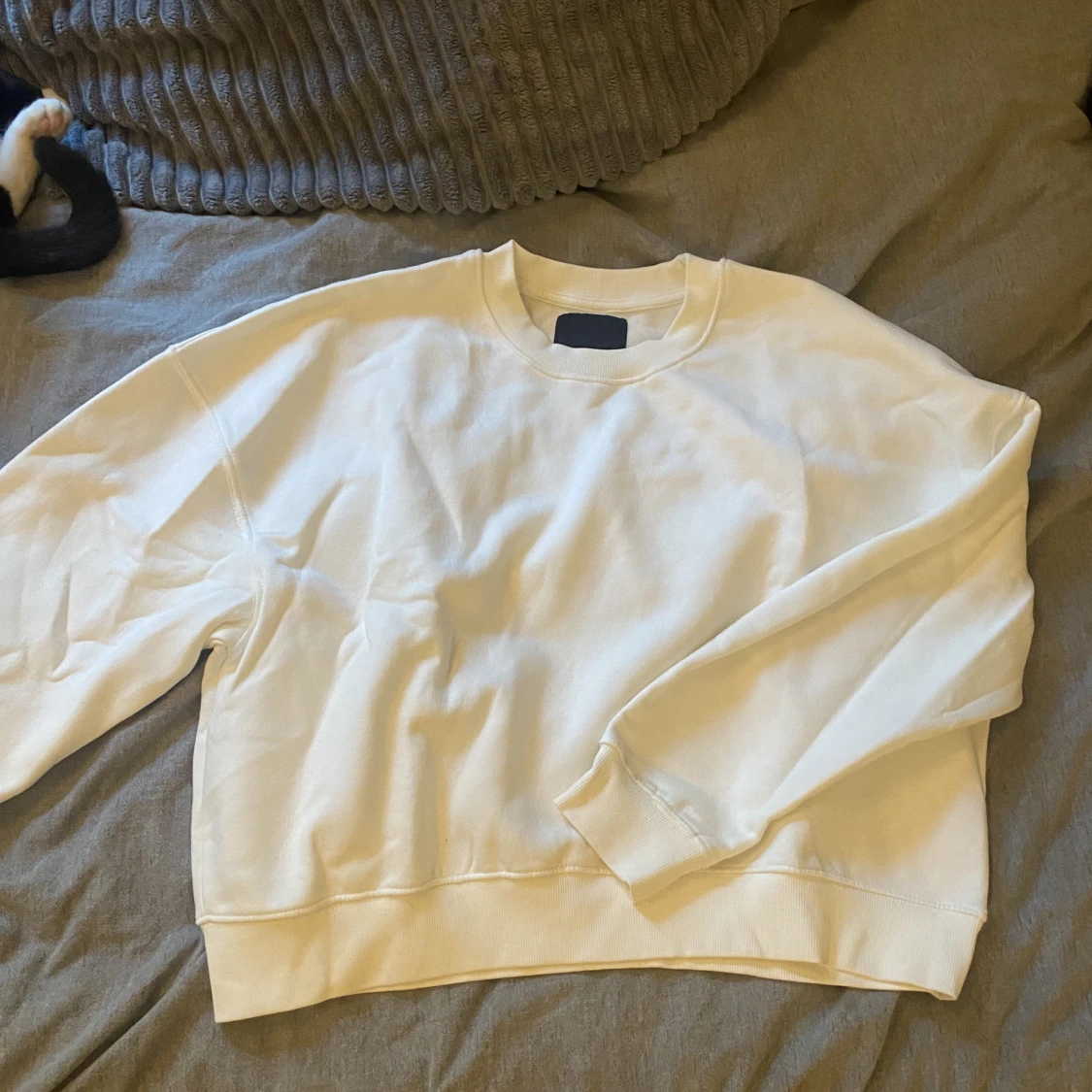 Vit sweatshirt, jättesmjukt material på insidan, storlek L men kort modell, 80kr + frakt🤍