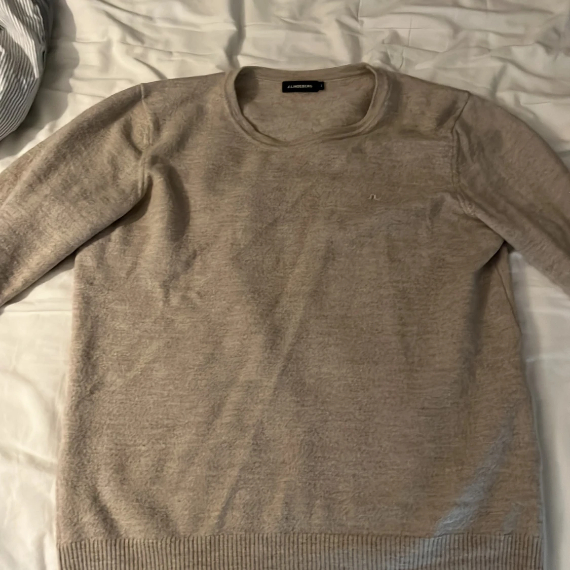 Snygg beige stickad tröja från J.Lindeberg i 100% merinoull. Tröjan har rund hals, diskret broderad logga på bröstet och ribbade muddar vid ärmslut och nederkant. Perfekt för dig som gillar stilrena och mjuka plagg. Storlek S borde nog passa också