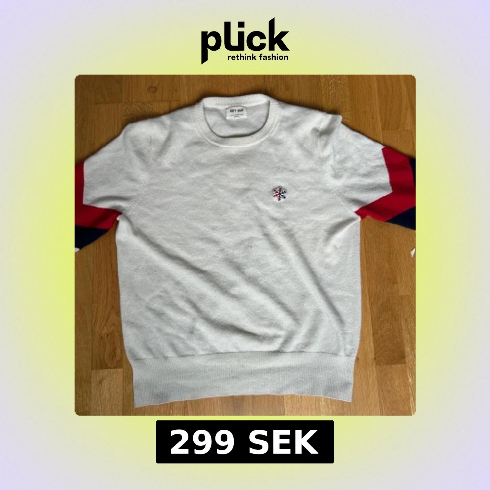 Vit stickad tröja i 100% kashmir från Soft Goat. Tröjan har långa ärmar med breda ränder i rött och mörkblått på ärmarna samt ett broderat snöflingemärke på bröstet. Den är i strlk S. Pris kan sänkas vid snabb affär