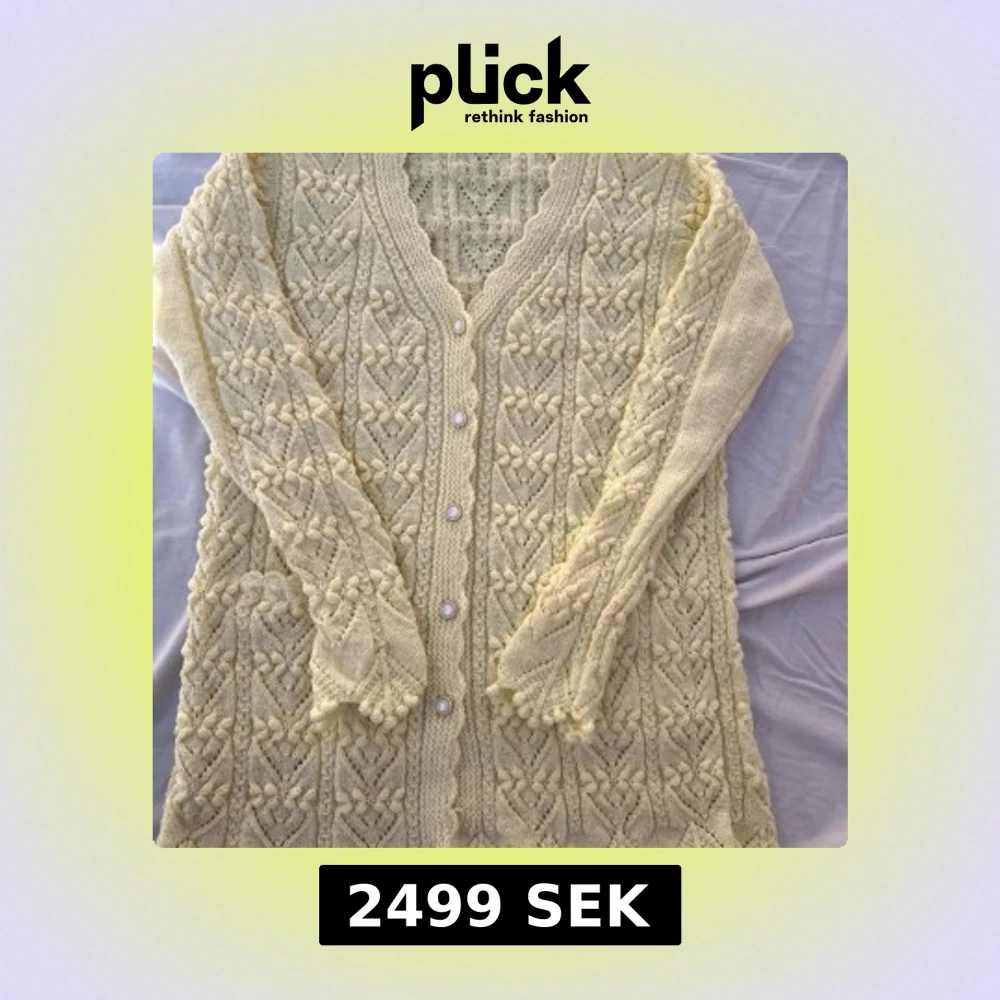 Superfin benvitt stickad kofta med vackert mönster och pärlknappar. Koftan har lång ärm, v-ringning och detaljerade virkade kanter. Perfekt för lager-på-lager och ger en mysig vintagekänsla till din outfit.