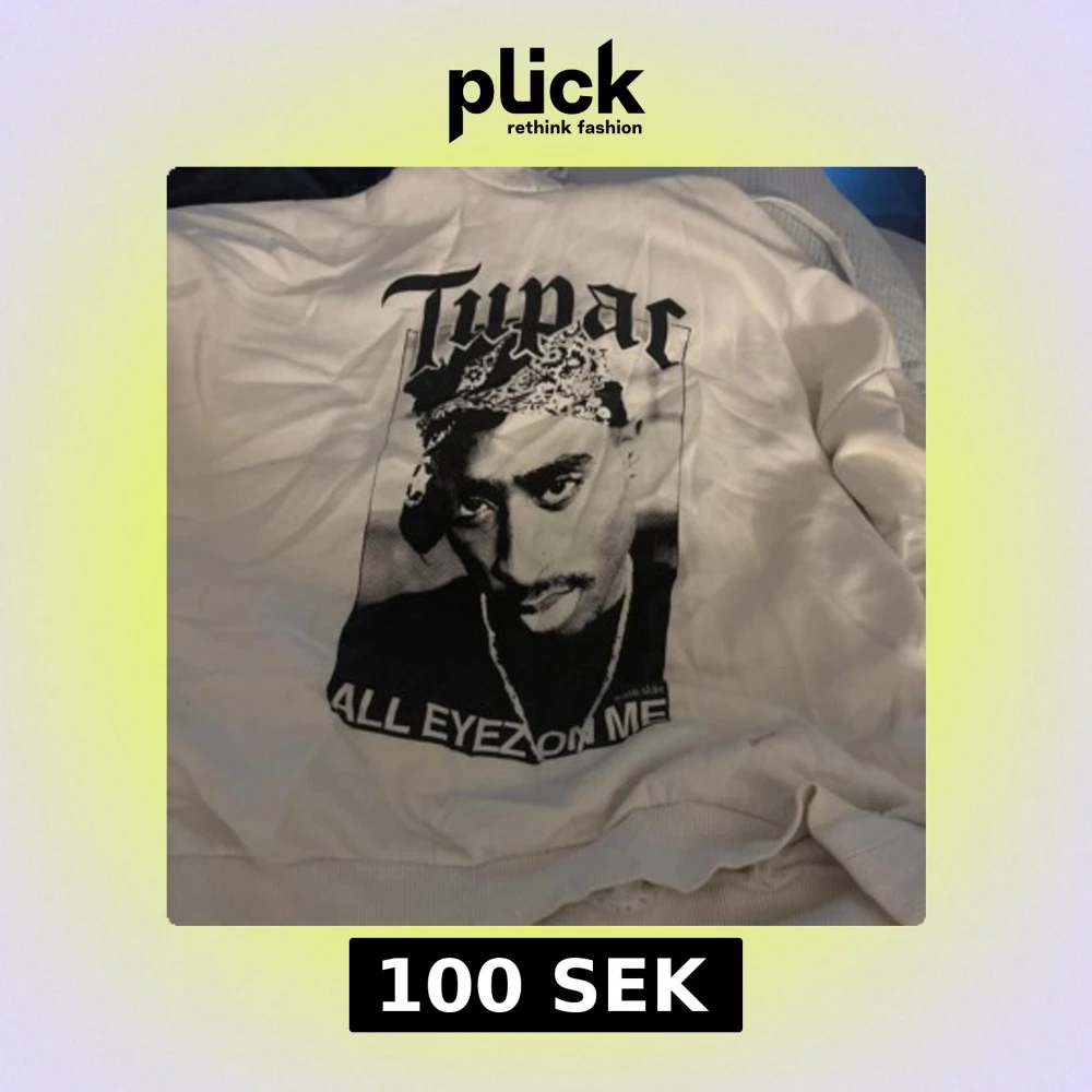 Vit hoodie från Bershka med stor svart Tupac-print och texten 'ALL EYEZ ON ME' på framsidan. Stor tryckt Tupac-logga även på ryggen. Klassisk huva med snörning och ribbade muddar. Perfekt för dig som gillar streetstyle och hiphop.
