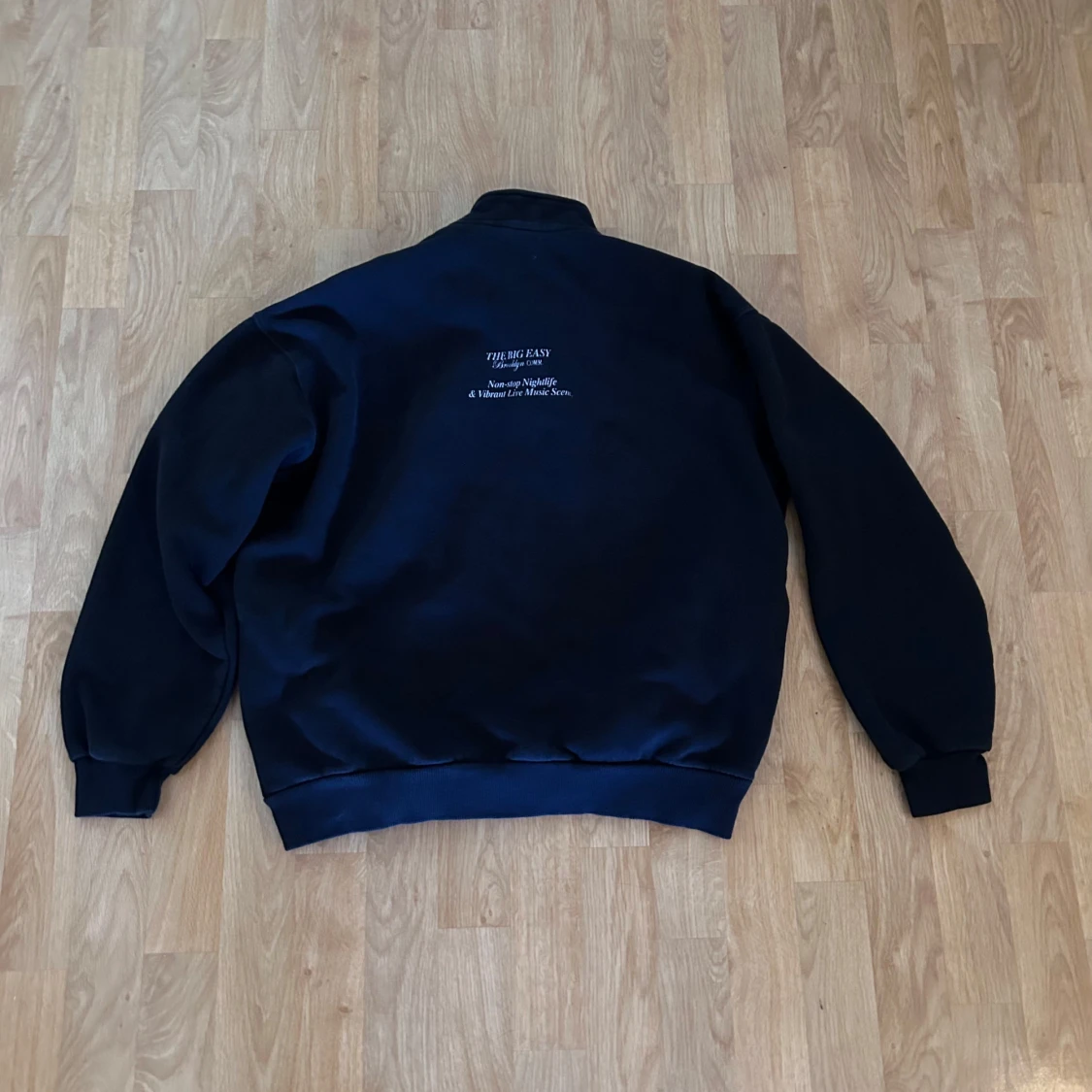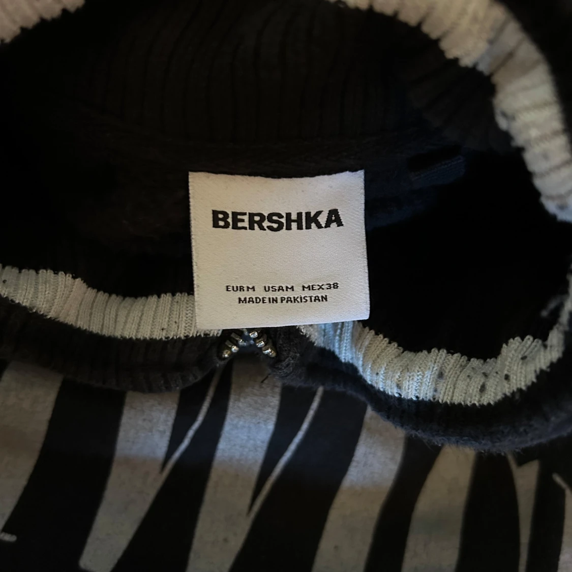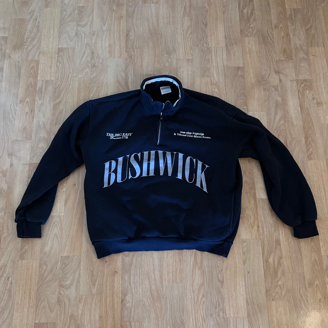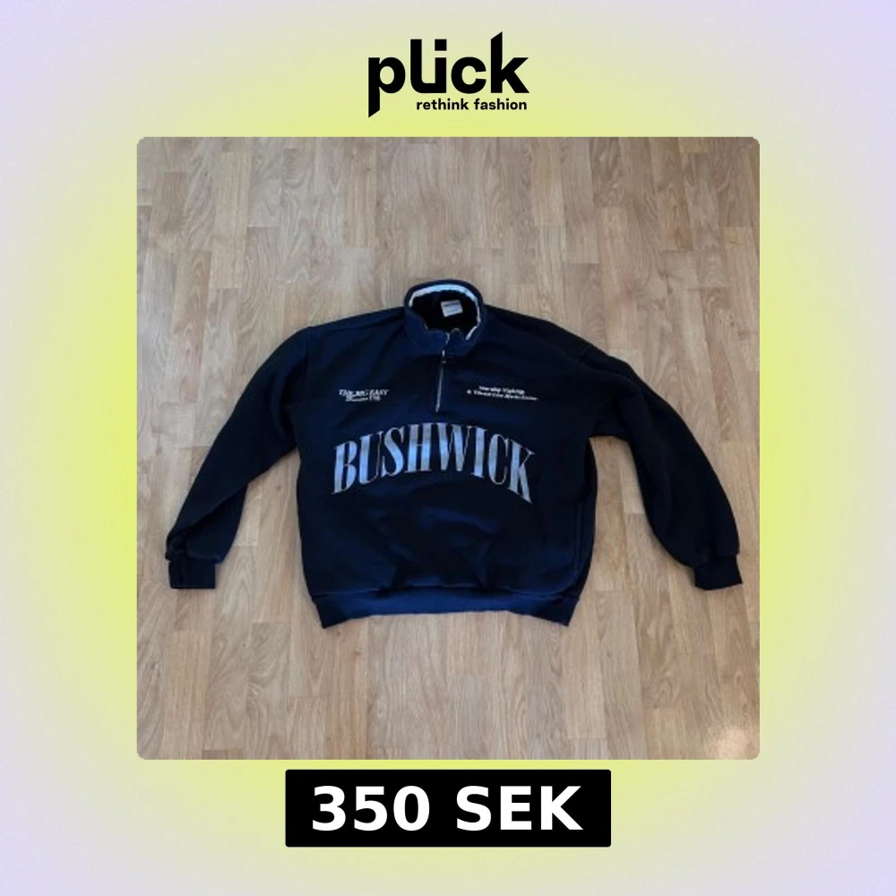Svart sweatshirt från Bershka med stor BUSHWICK-print framtill och vit text på bröstet och ryggen. Tröjan har half zip, ståkrage med ribbad kant och långa ärmar med muddar.