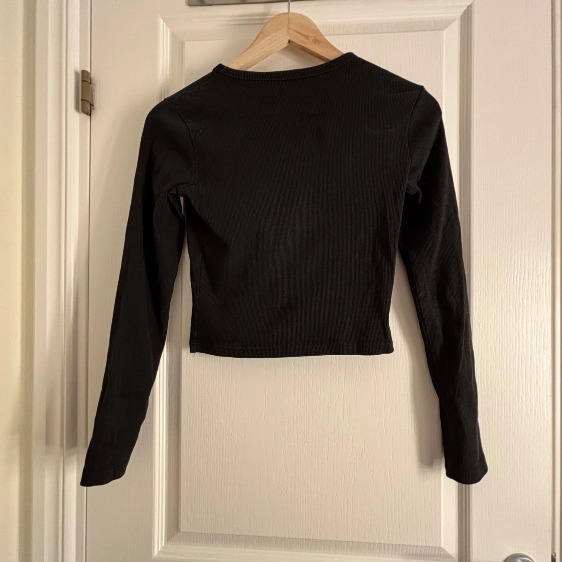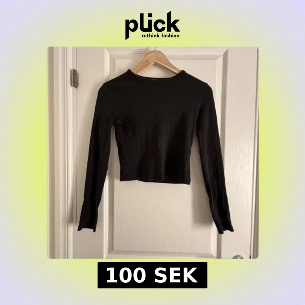 Säljer en svart ribbad topp från Bershka. Den har en croppad design med långa ärmar, perfekt för en stilren look. Passar bra till både jeans och kjol. Perfekt för höst och vår!