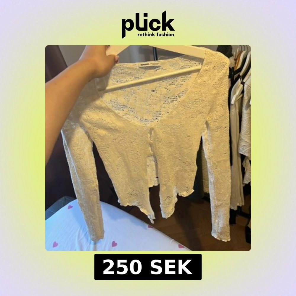 Säljer en vit blus från Bershka i storlek XS. Blusen är gjord i spets med v-ringning, långärmad och har små knappar framtill. Den har en lätt croppad passform och vågig kant nedtill. Perfekt för dig som gillar romantiska detaljer och ljusa toner.