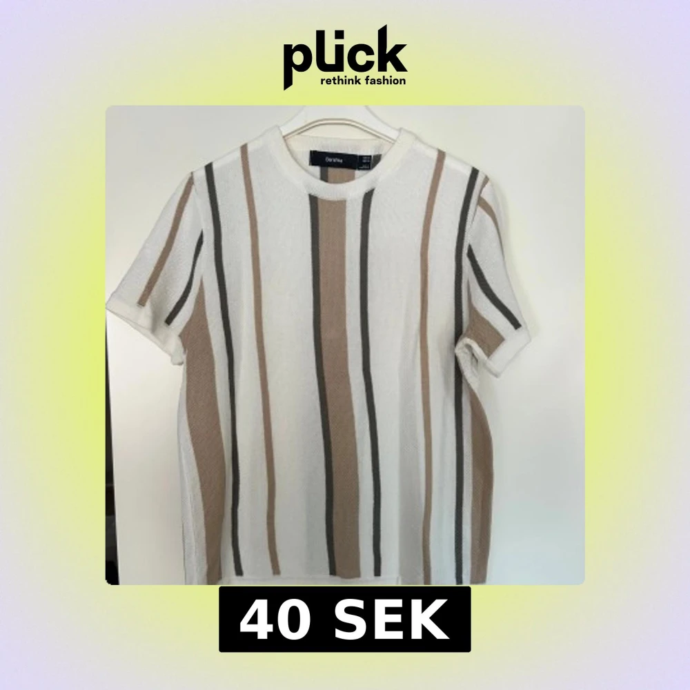 Säljer en stickad t-shirt från Bershka med vertikala ränder i vitt, beige och grått. Tröjan har korta ärmar, rund halsringning och en relaxed fit. Perfekt för dig som gillar en chill och stilren look.