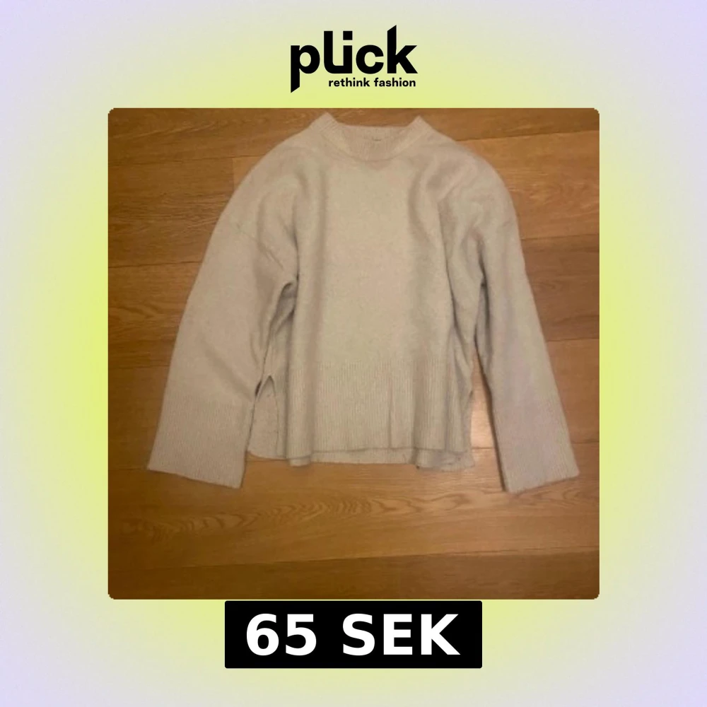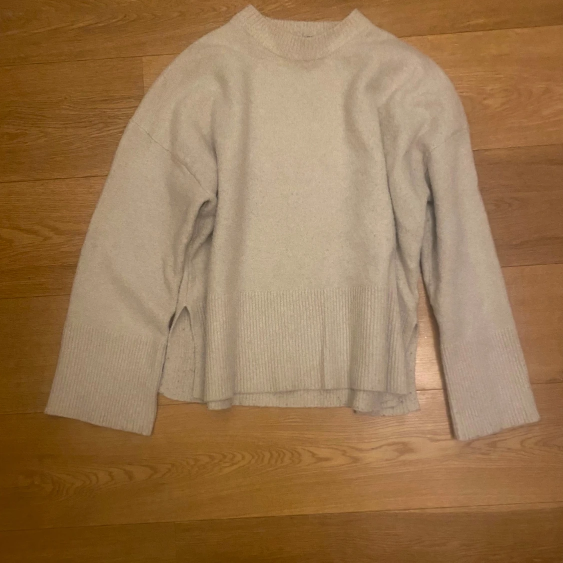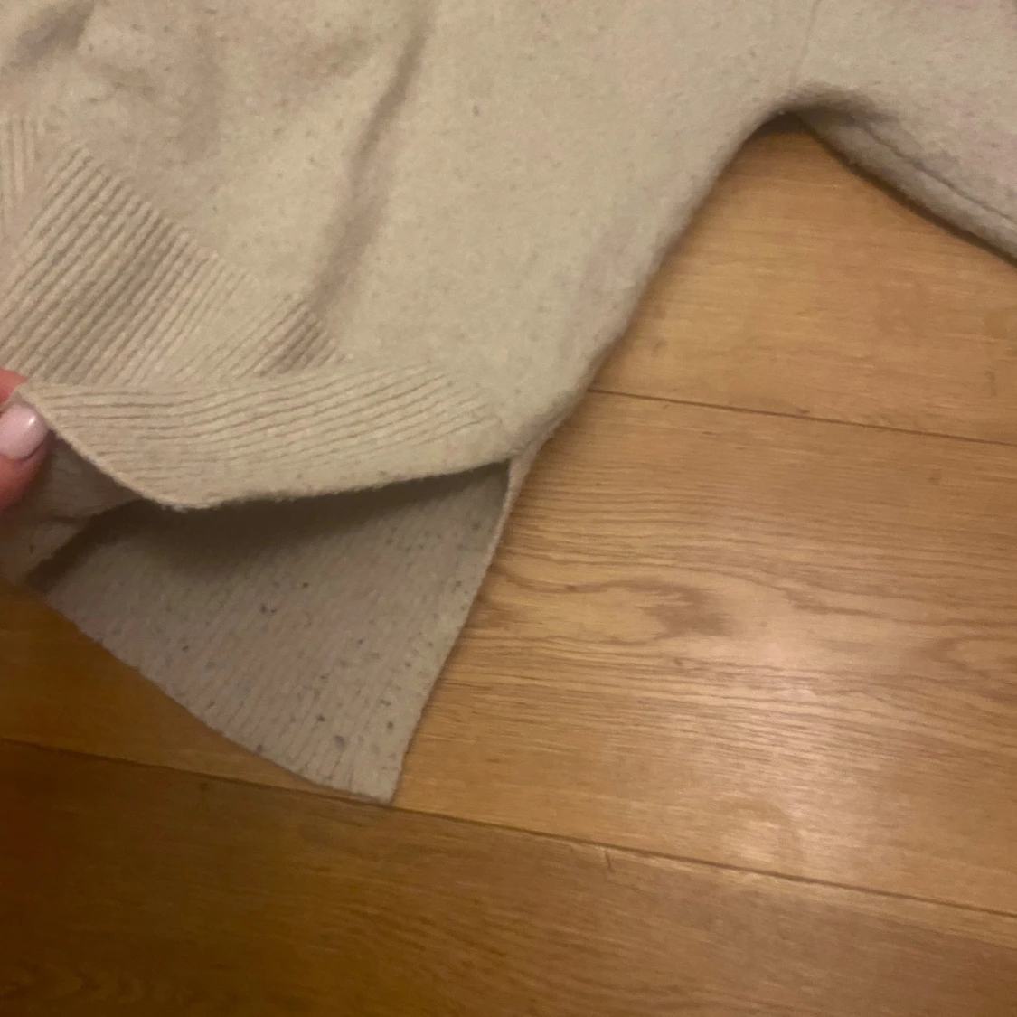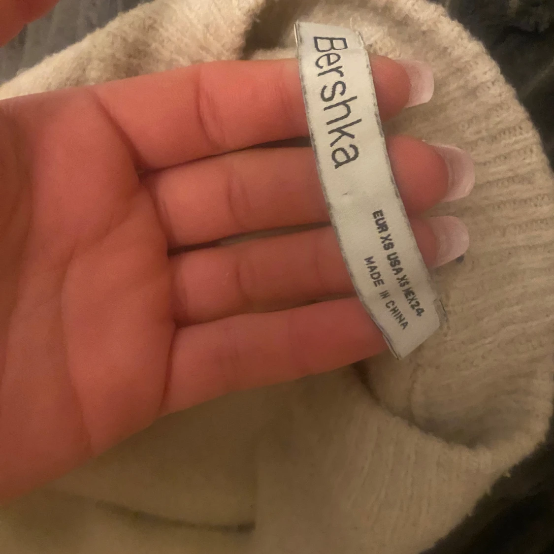 Mysig beige stickad tröja från Bershka i storlek XS. Tröjan har lång ärm, ribbad kant nedtill och vid ärmslut samt en liten slits på sidan.