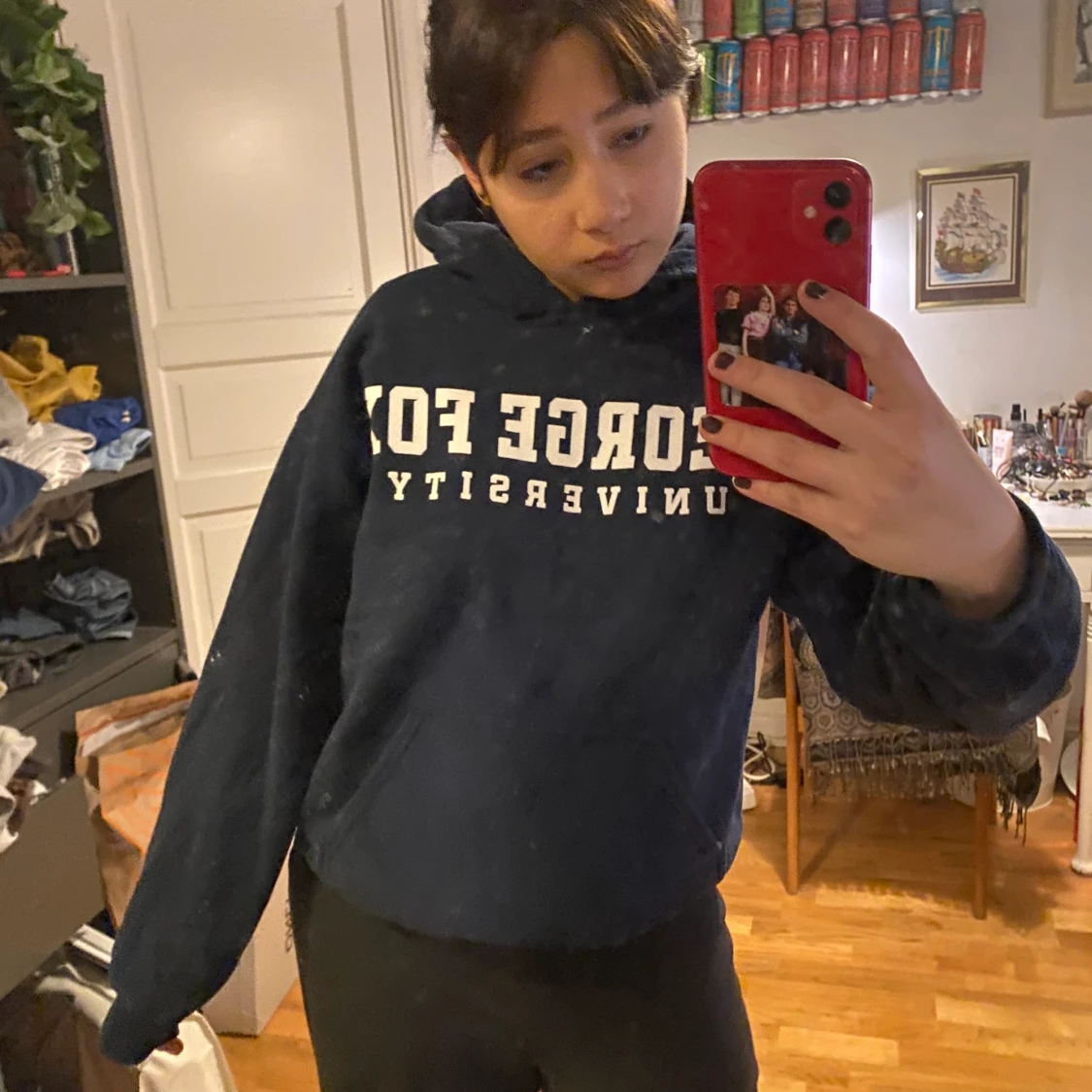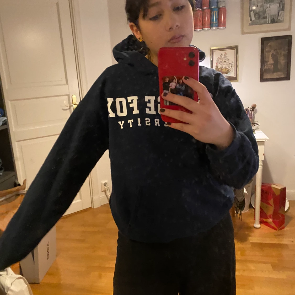 Snygg Navy hoodie! Köpt från beyond retro! Nopprig på insidan och 2 st vita/grå fläckar som jag tror går bort i tvätten! Sitter bra på mig som är en M! Men om man vill ha riktigt oversized funkar den nog bäst på S/XS!