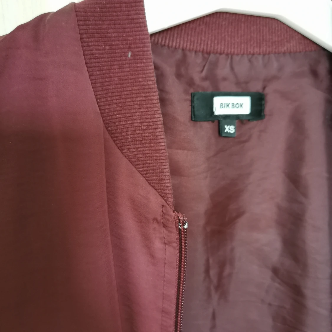 Vinröd kofta/tröja i aningen glansigt material i storlek xs från bik bok. Använt skick.