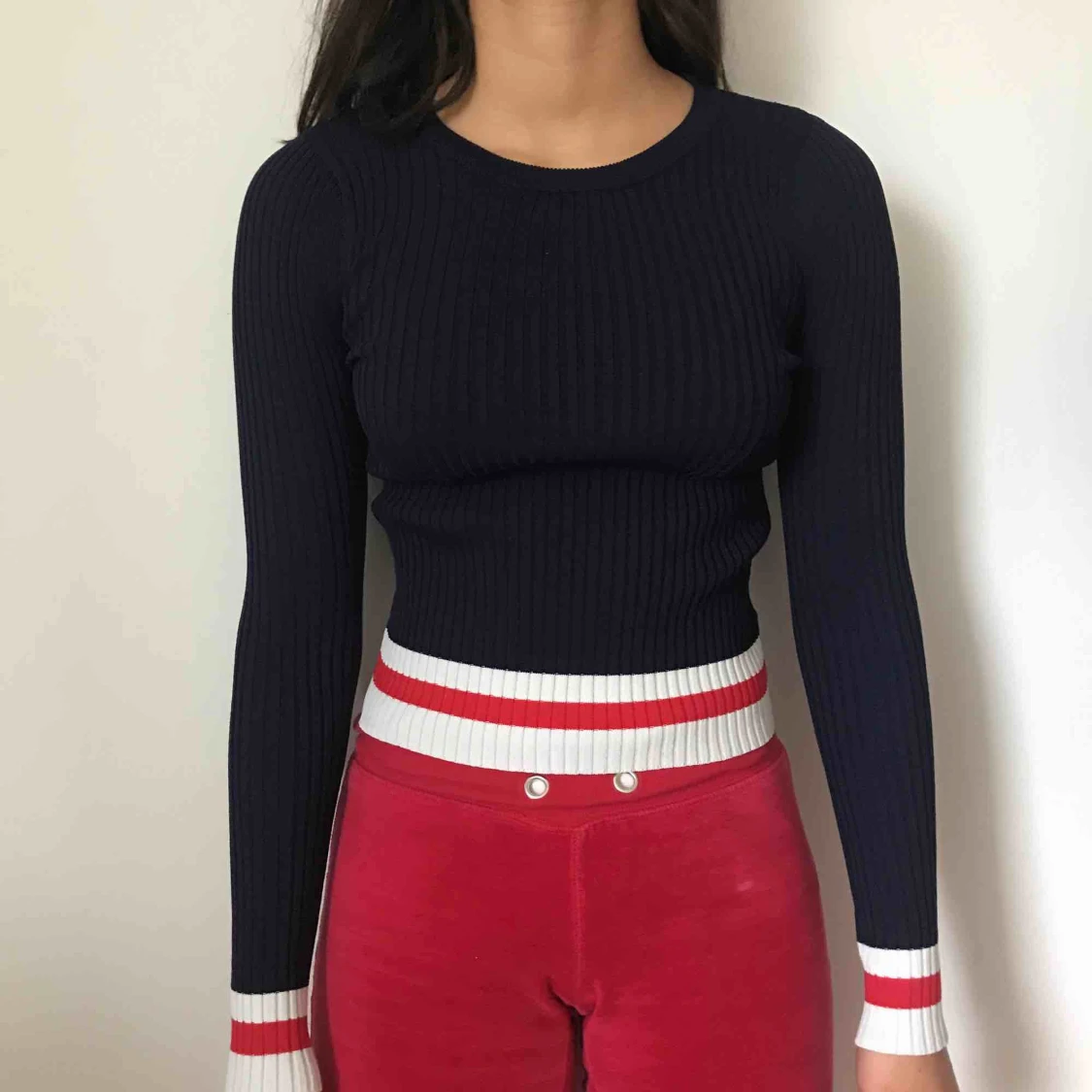 En röd, vit och blå ribbad tröja från Bik Bok. Kostar 100kr inklusive frakt.