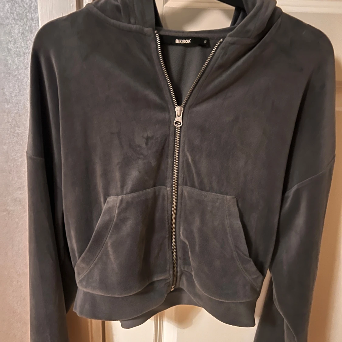 Mysig grå hoodie i velour från Bik Bok med dragkedja framtill, huva och två stora fickor. Croppad modell med långa ärmar och relaxed fit, perfekt för chill dagar. Byxorna kan man även köpa till. Byxorna är i storlek xs men har töjts ut lite så skulle säga funkar som S med! Hoodie storlek: S. Byxorna: 150kr hoodien: 150kr men tillsammans kostar de 250kr!