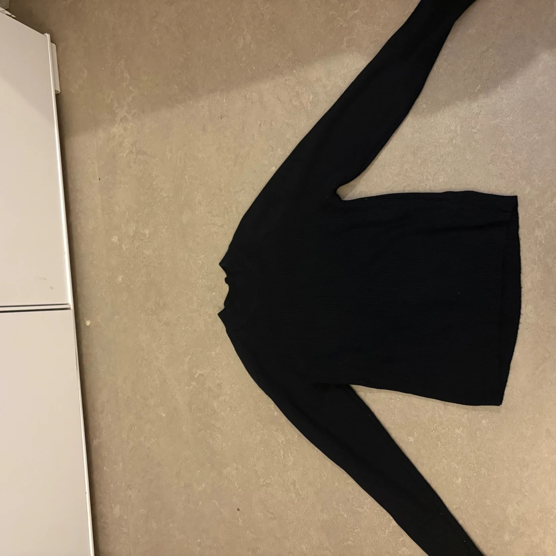 En svart, ribbad stickad tröja med lång ärm och hög hals. Perfekt för lager-på-lager och passar till allt. Enkel och stilren design som funkar till jeans eller kjol.