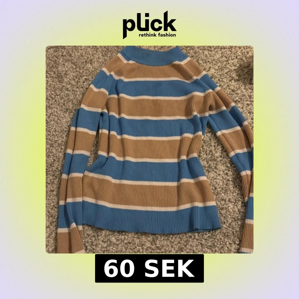 Snygg randig tröja i blått, beige och vitt. Tröjan är ribbad med långa ärmar och en hög krage. Perfekt för en stilren look.
