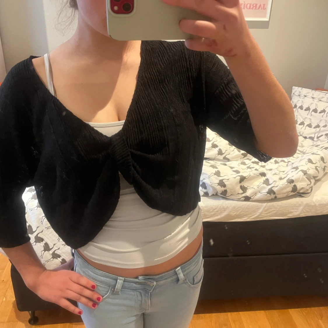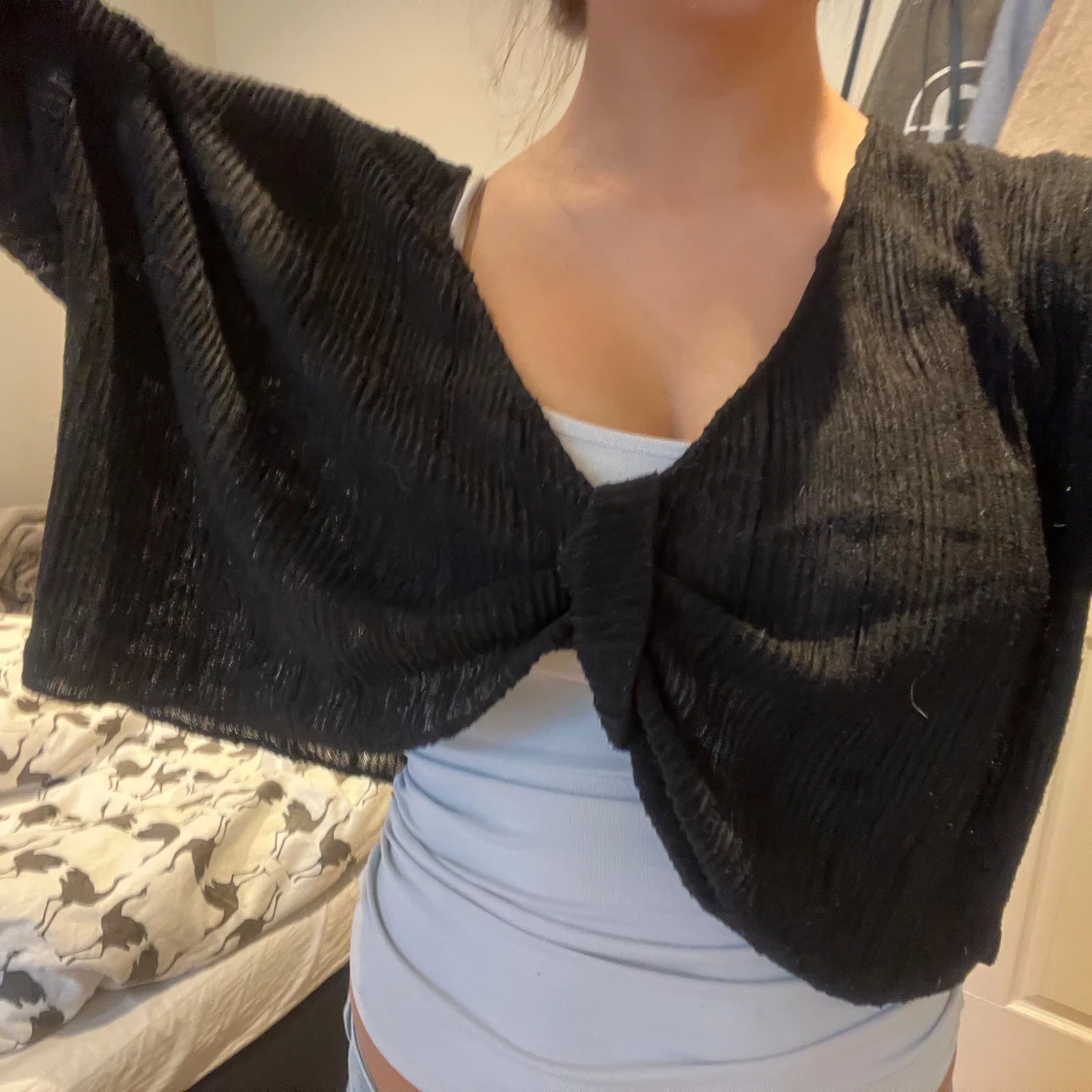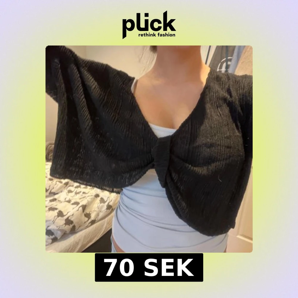 Säljer en svart croppad kofta med knyt framtill. Koftan har trekvartsärm och är tillverkad i ett ribbat material som ger en snygg struktur. Perfekt att slänga över ett linne eller topp för en cool look.