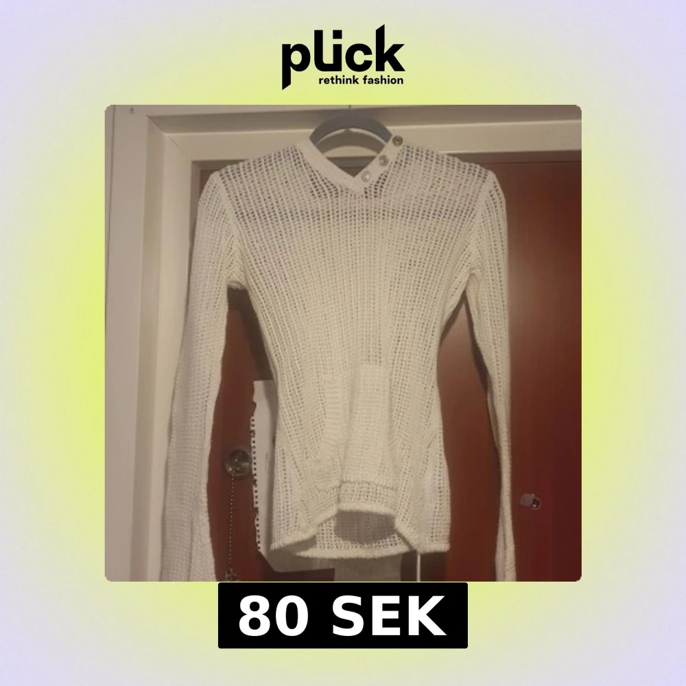 Säljer en vit stickad tröja med unika knapplösningar vid halsen. Tröjan har en djup v-ringning och långa ärmar och luva perfekt för lager-på-lager under kyliga dagar. Den är både stilren och bekväm, vilket gör den till ett mångsidigt tillskott i garderoben.