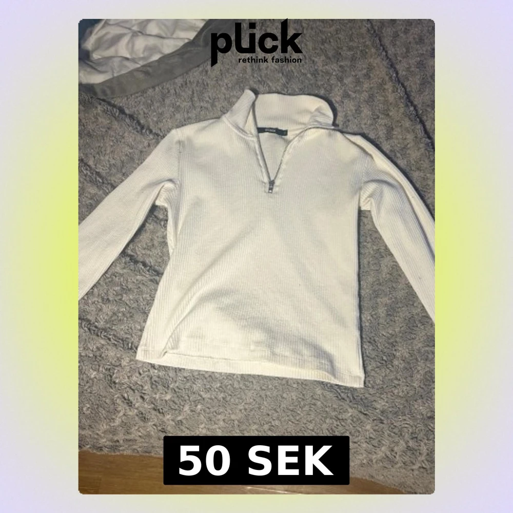 Vit långärmad tröja i ribbat material med halv dragkedja framtill och hög krage. Perfekt för lager på lager och enkel att matcha med olika outfits. Tröjan har en clean och stilren look som passar till många tillfällen.