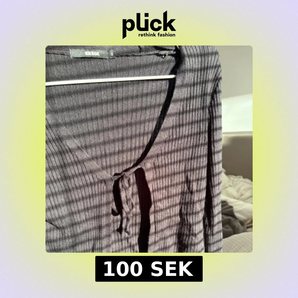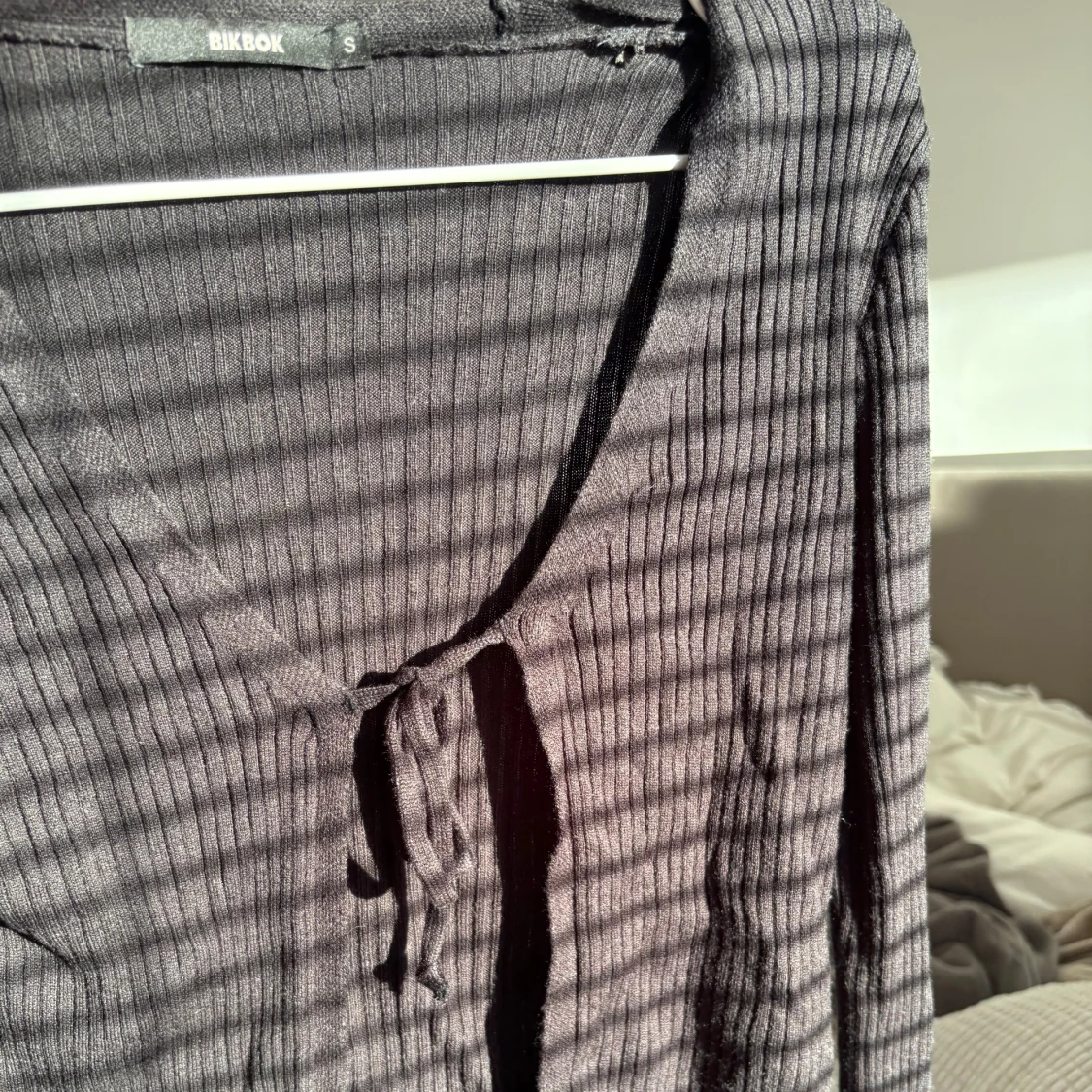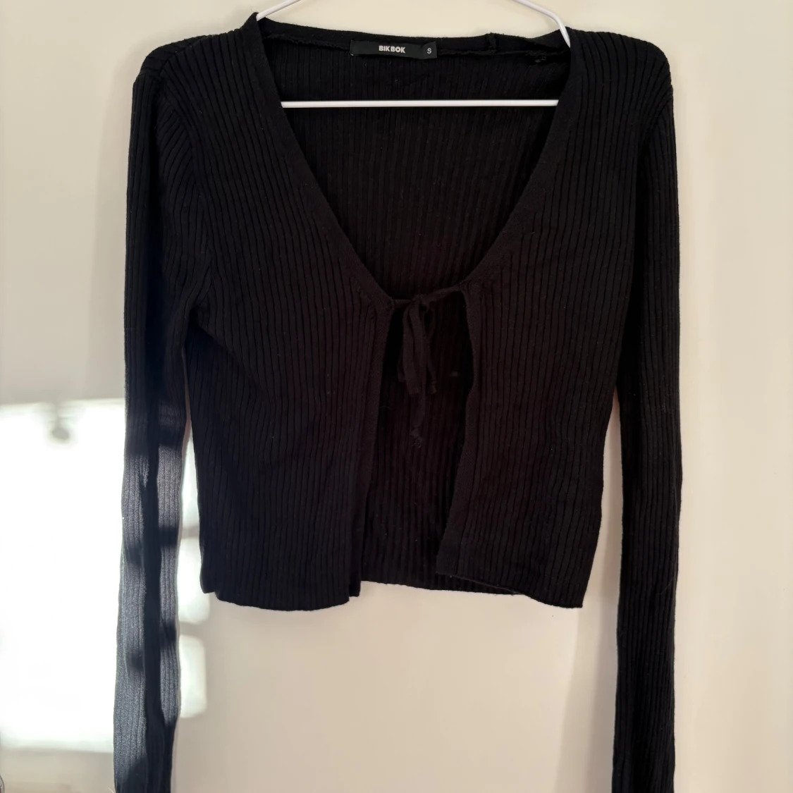 Svart ribbad bolerotopp från BikBok med lång ärm och croppad passform. Toppen har v-ringning och knyt framtill, vilket ger en trendig och avslappnad look. Perfekt att styla över ett linne eller klänning för en extra touch.