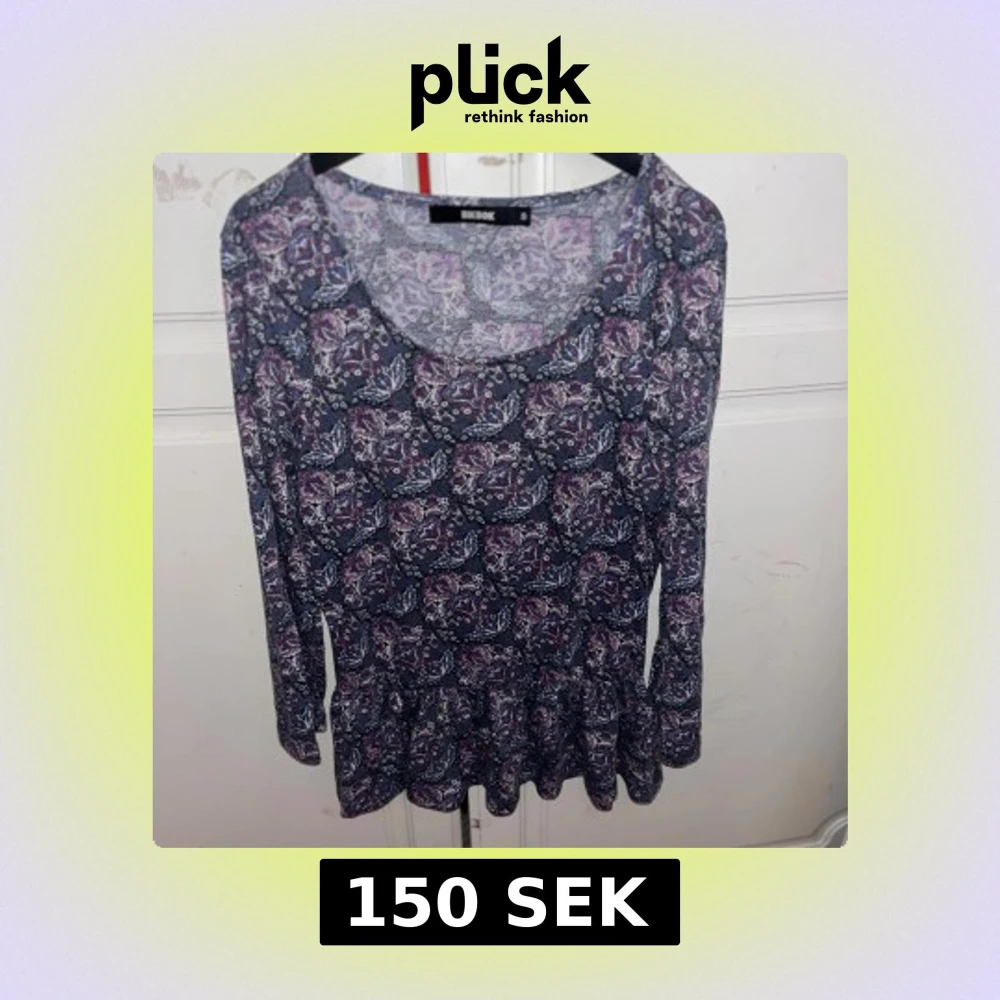Supersöt långärmad topp från Bik Bok i storlek S. Mörkblå botten med blommigt mönster i lila, rosa och vitt. Rund halsringning och volang nertill ger en extra feminin touch. Perfekt att styla med jeans eller kjol för en trendig look.