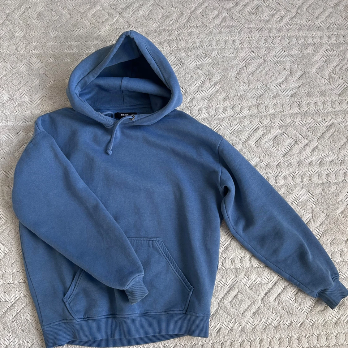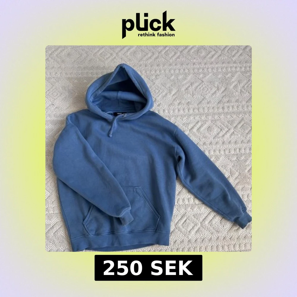 Säljer en blå hoodie från Bik Bok med stor huva och känguruficka framtill. Tröjan har ribbade muddar vid ärmslut och nederkant samt snörning i huvan. Perfekt för chill dagar eller när du vill vara extra bekväm.