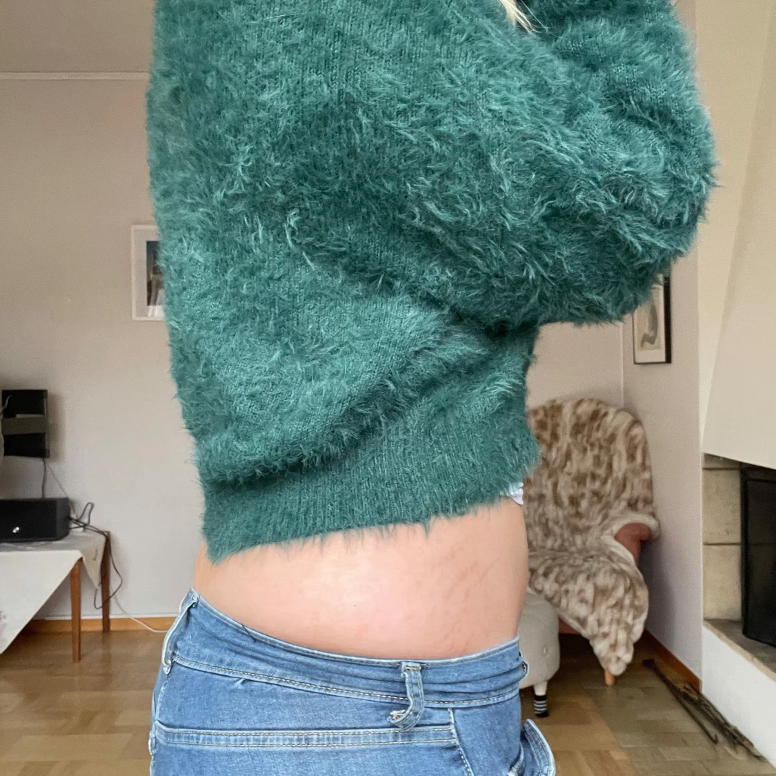 Säljer en supermjuk och fluffig grön tröja Perfekt för att hålla sig varm och stilren. Tröjan har långa ärmar och en rund halsringning. Passar perfekt till jeans eller kjol för en avslappnad look.