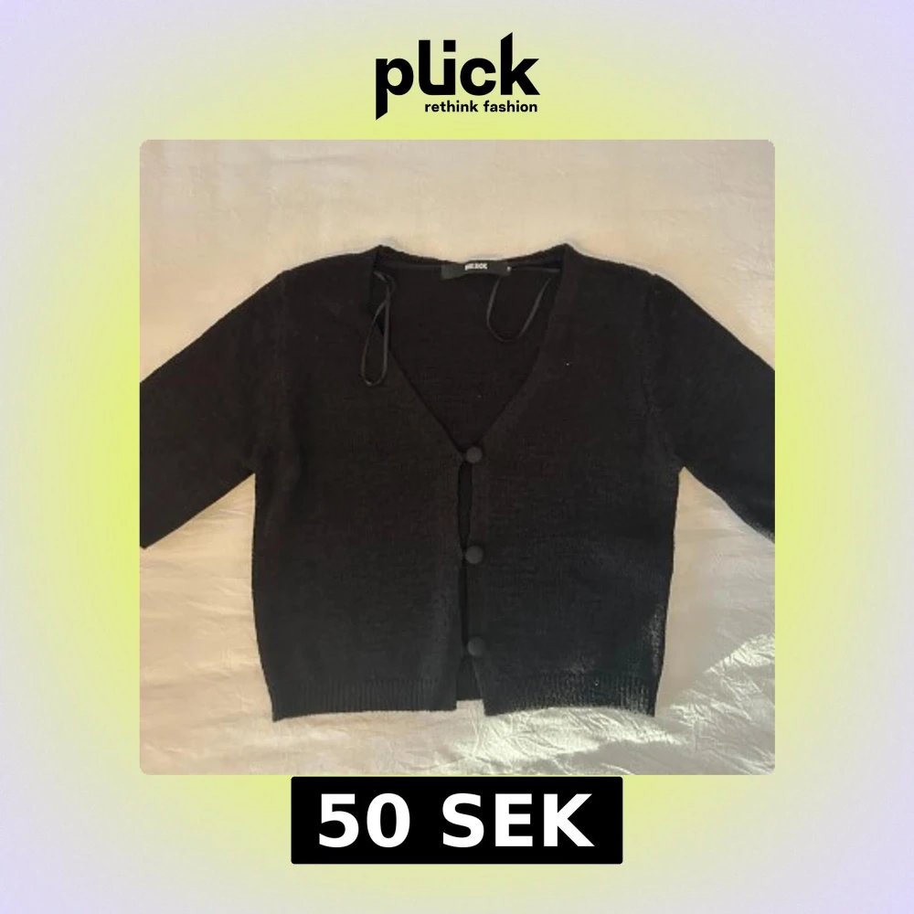 Svart stickad kofta från Bik Bok i storlek S. Koftan har v-ringning, tre stora knappar framtill och ribbade muddar vid ärmslut och nederkant. Croppad passform och trekvartsärm ger en chill och trendig vibe. Perfekt att slänga över en topp för extra stil.