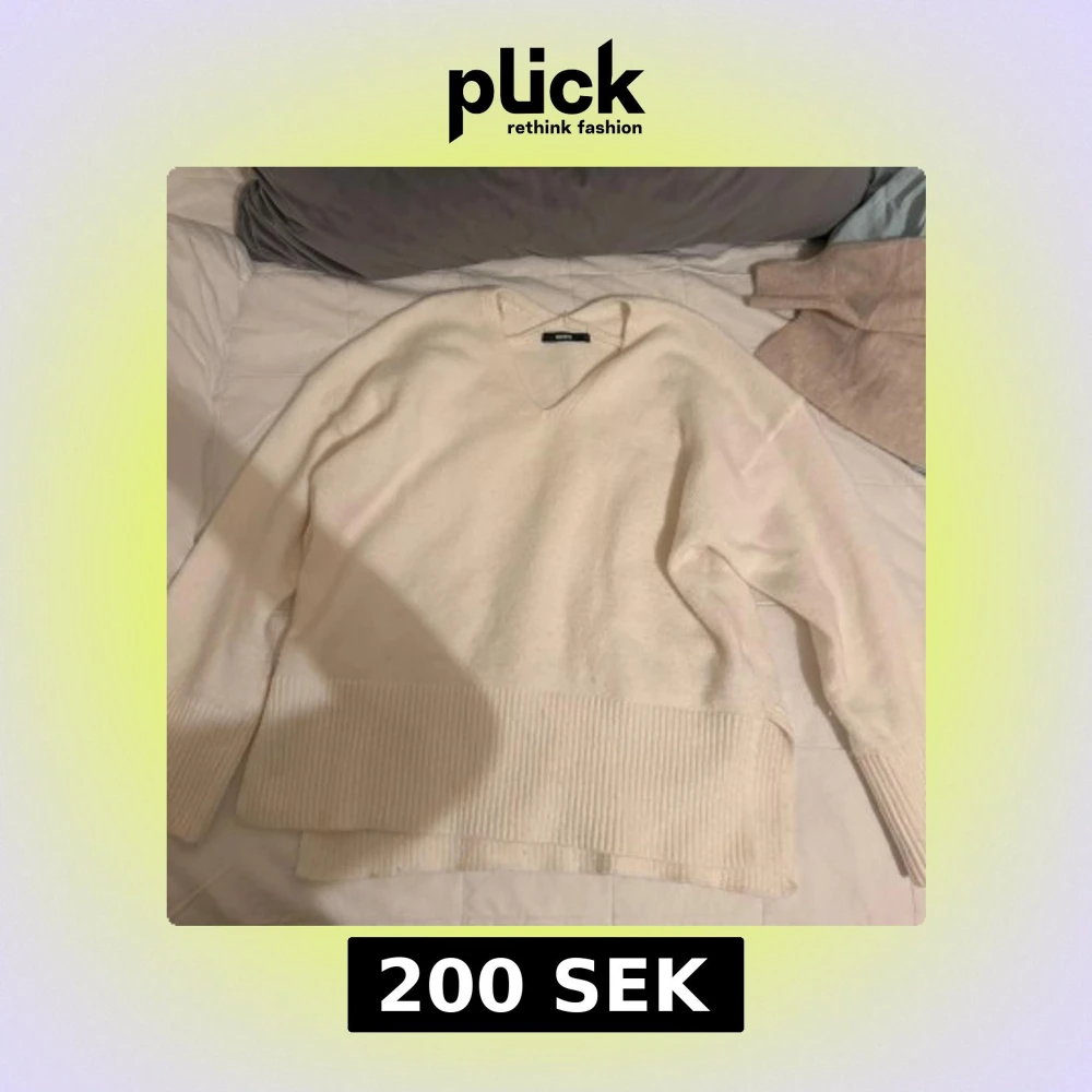 Mysig vit stickad tröja från BikBok i storlek S. Tröjan har v-ringning, långa ärmar och bred ribbad kant nedtill och vid ärmsluten. Perfekt för lager-på-lager och chill dagar.