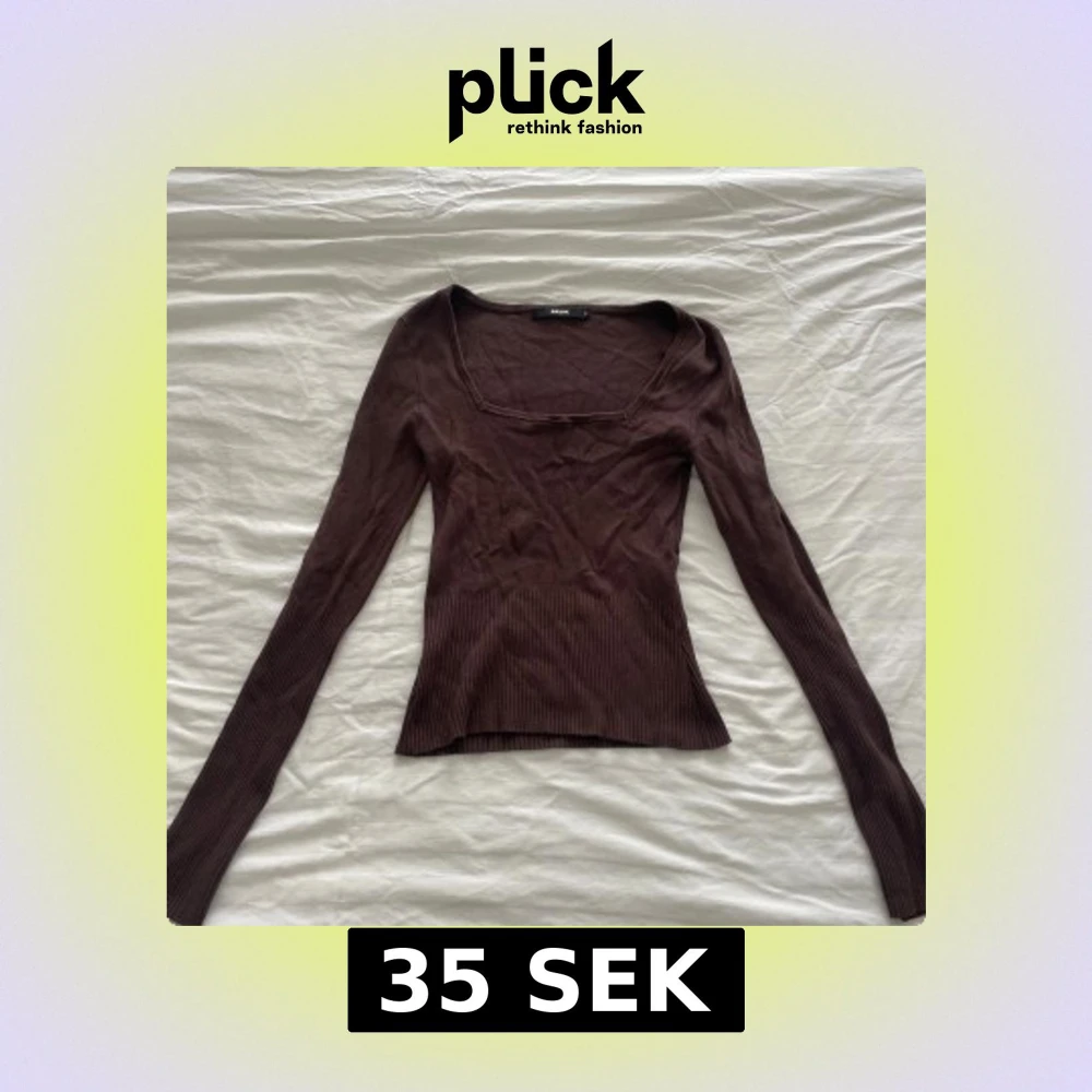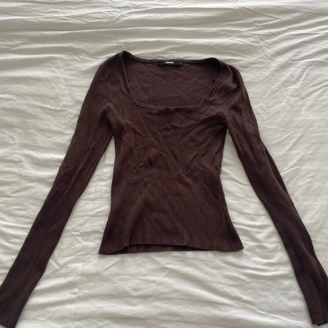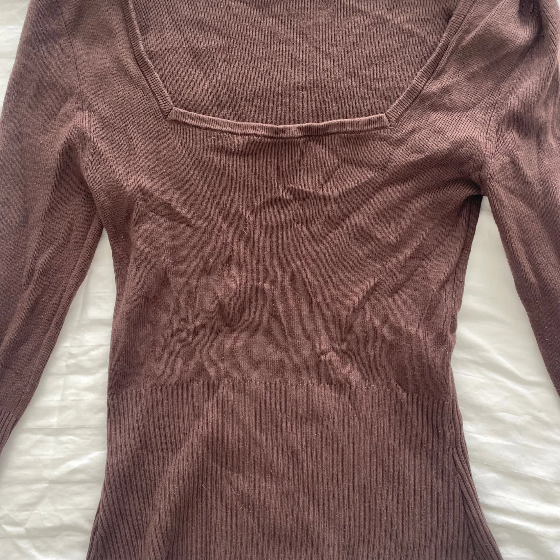 Mörkbrun tröja från Bik Bok med lång ärm och fyrkantig ringning. Tröjan har ribbade detaljer vid midjan och ärmarna, vilket ger en snygg och figurnära passform.