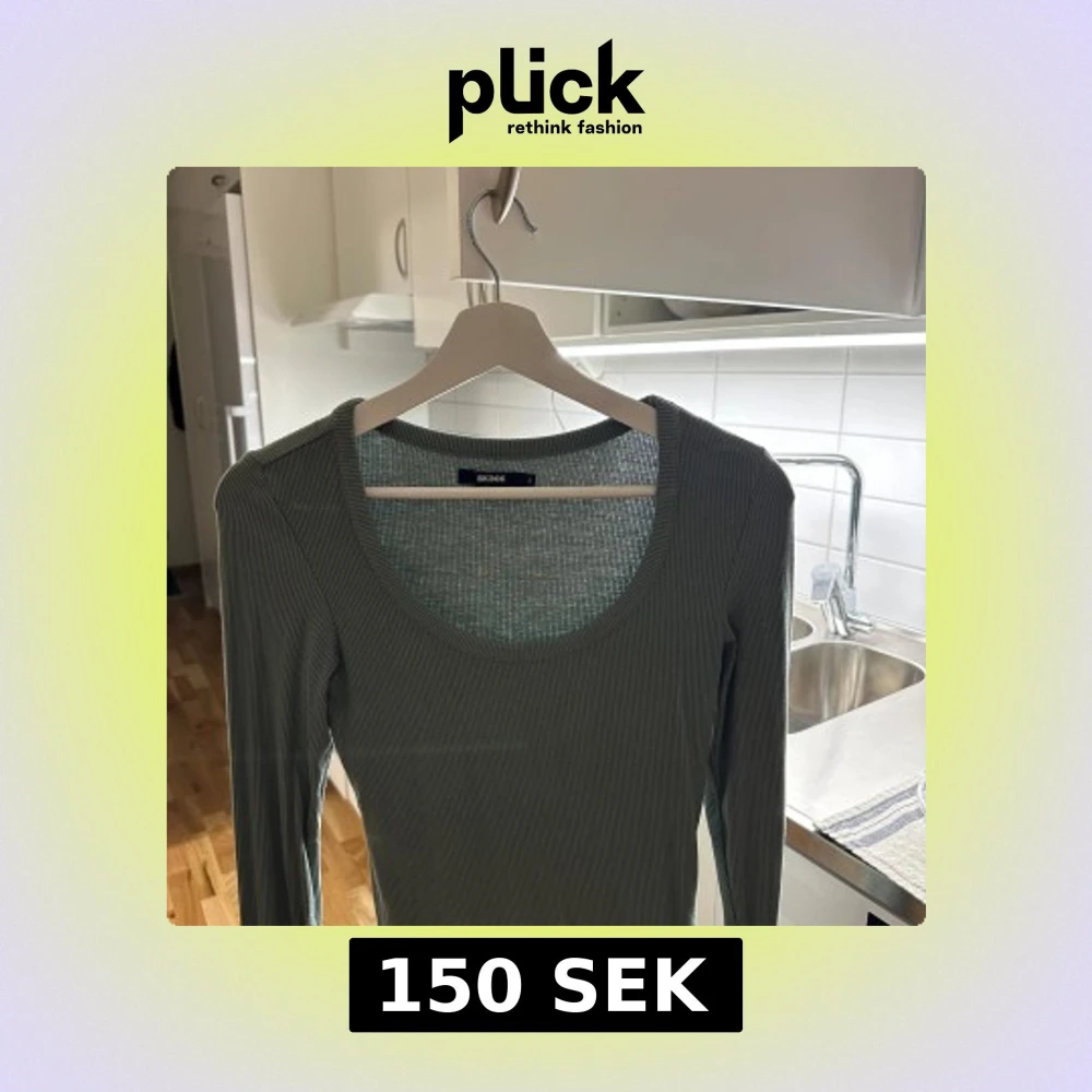 Säljer en stilren grön ribbad tröja från Bik Bok. Tröjan har en rund halsringning och långa ärmar, perfekt för lager-på-lager under kyligare dagar.