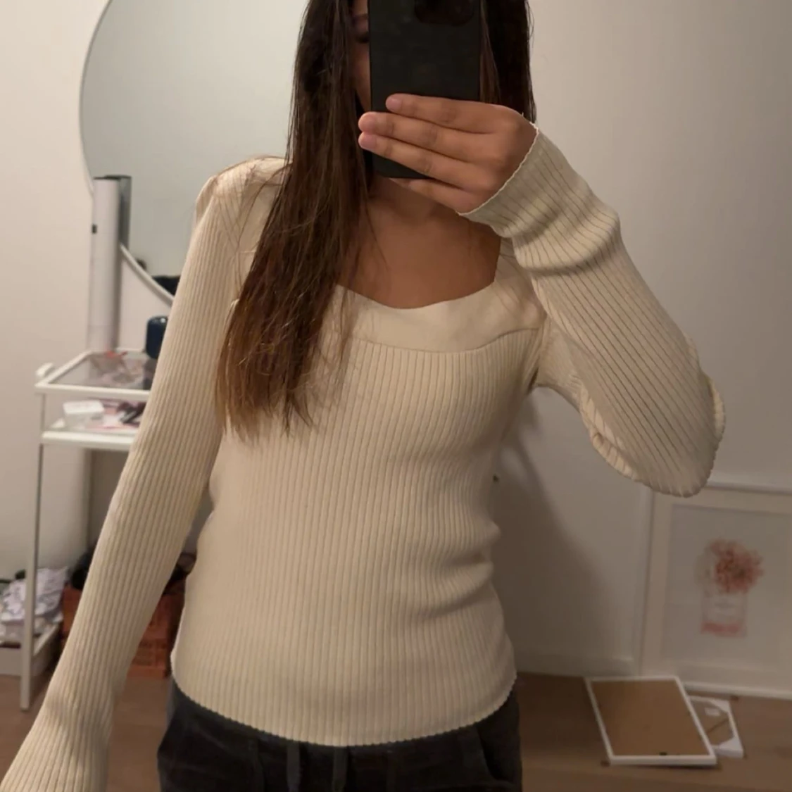 Säljer en ribbad beige långärmad tröja med fyrkantig ringning. Tröjan har en slim passform och är tillverkad i ett mjukt, stretchigt material som sitter snyggt på kroppen. Jätte snyg me ett par svarta jeans.