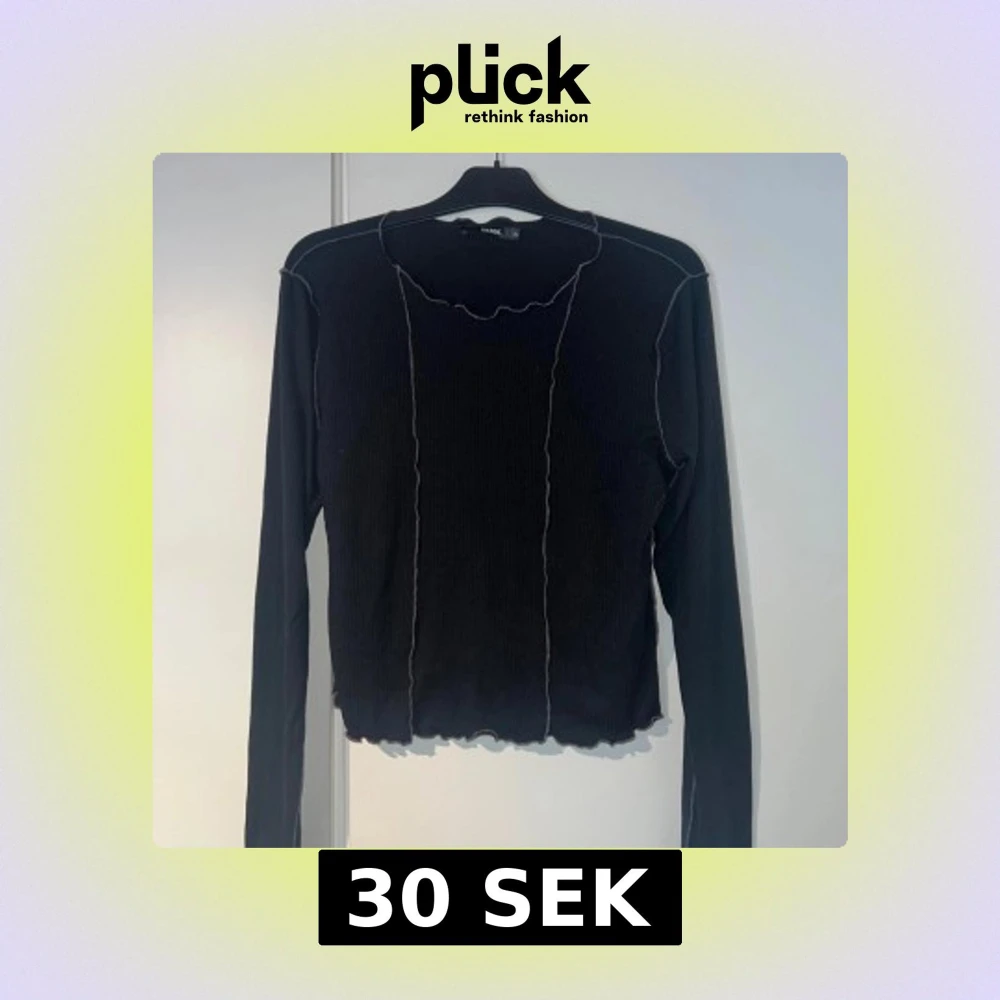 Svart ribbad långärmad tröja från BikBok med kontrastsömmar i lila och vågig kant vid ärmslut och nederkant. Tröjan har en tight passform och är tillverkad i mjukt stretchigt material, perfekt för lager-på-lager eller som statement-piece. Passar s-L