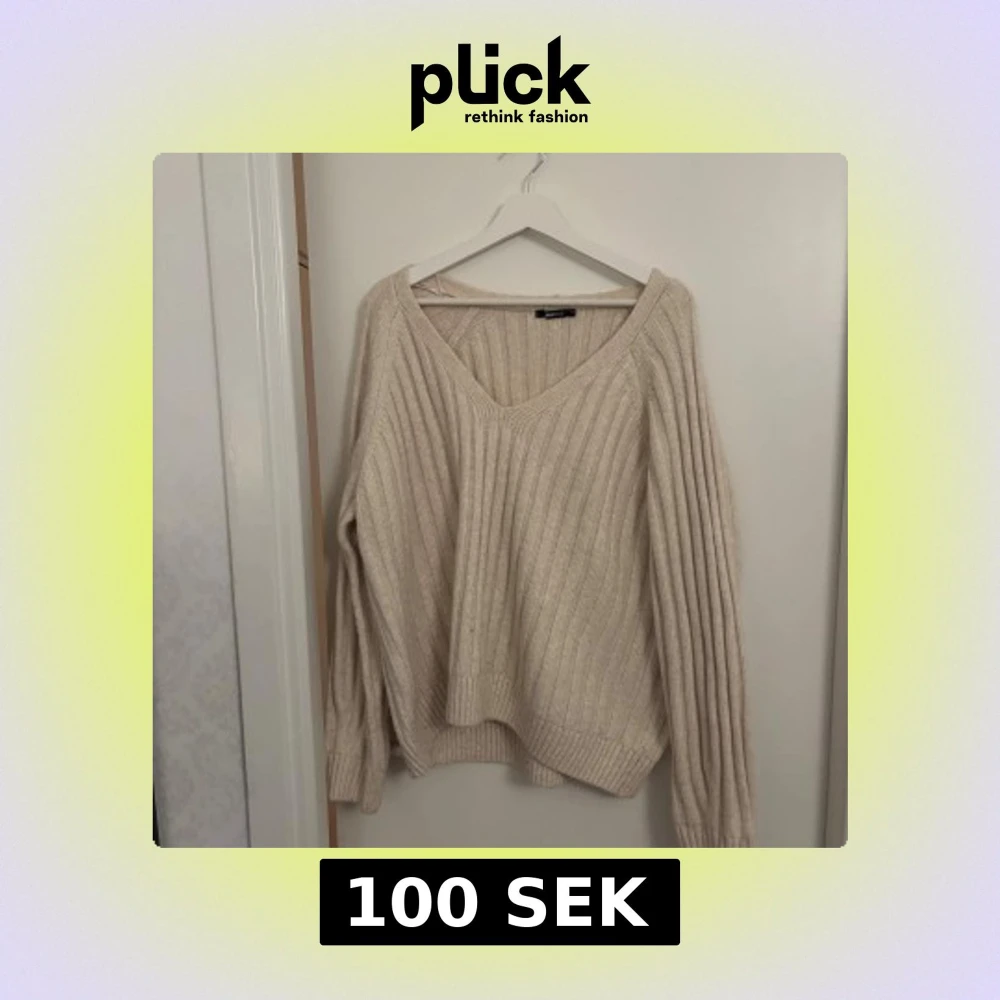 Mysig beige stickad tröja från Bik Bok med bred v-ringning och ribbad struktur. Tröjan har lång ärm och en loose passform som ger en avslappnad vibe. Perfekt för lager-på-lager under höst och vinter.