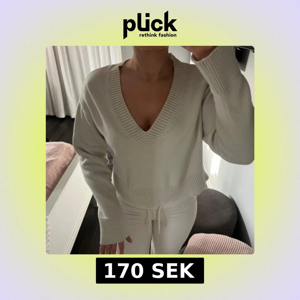 Säljer en stilren vit stickad tröja från Bik Bok. Tröjan har en djup v-ringning och långa ärmar med ribbade muddar💗
