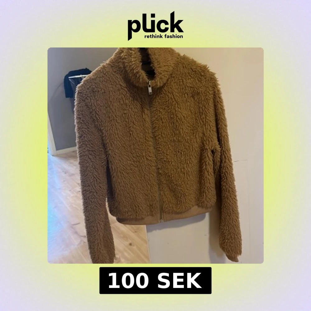 Säljer en beige teddyjacka med fluffig yta och ribbade muddar vid ärmslut och nederkant. Jackan har hög krage och stängs med dragkedja framtill. Perfekt för dig som gillar att vara mysig.