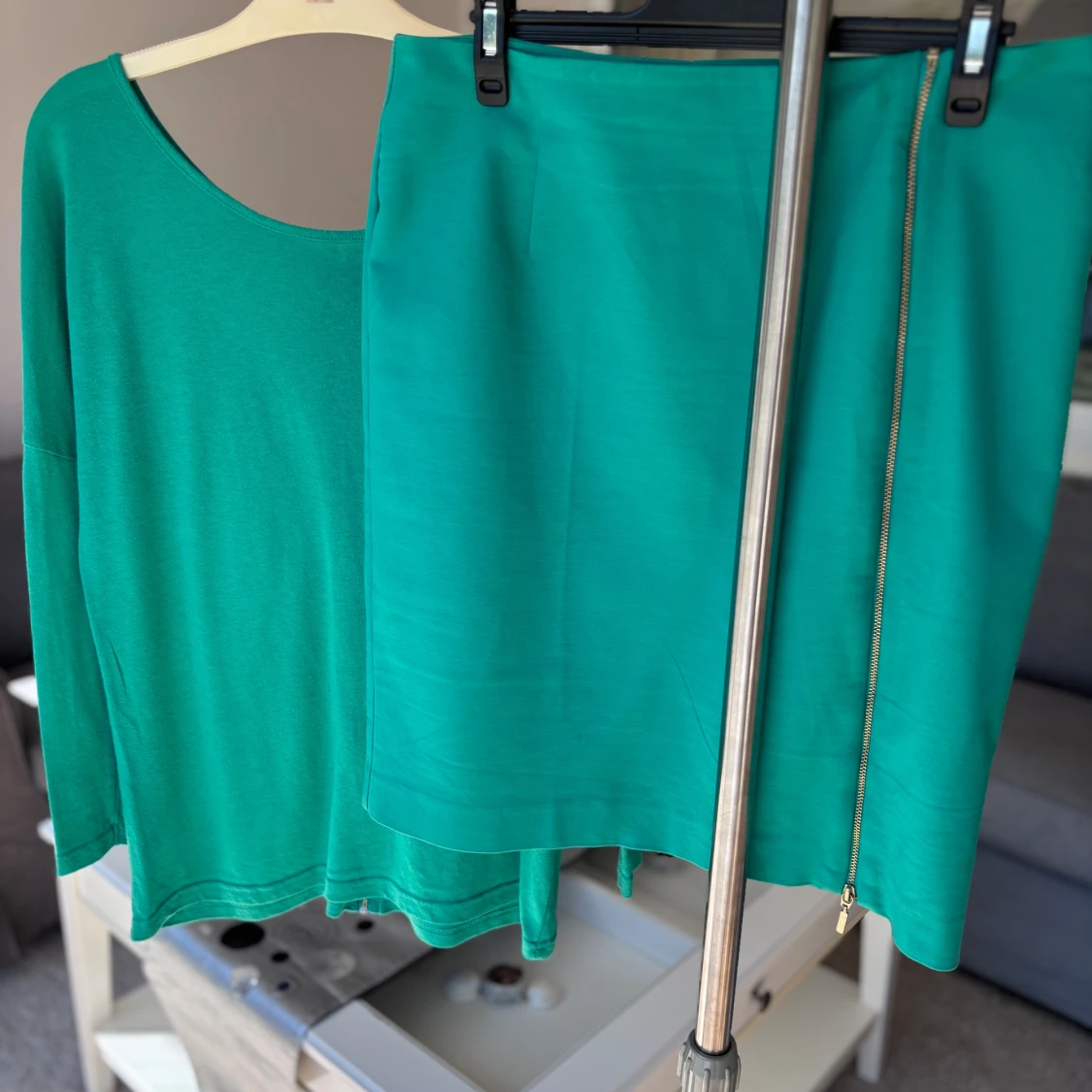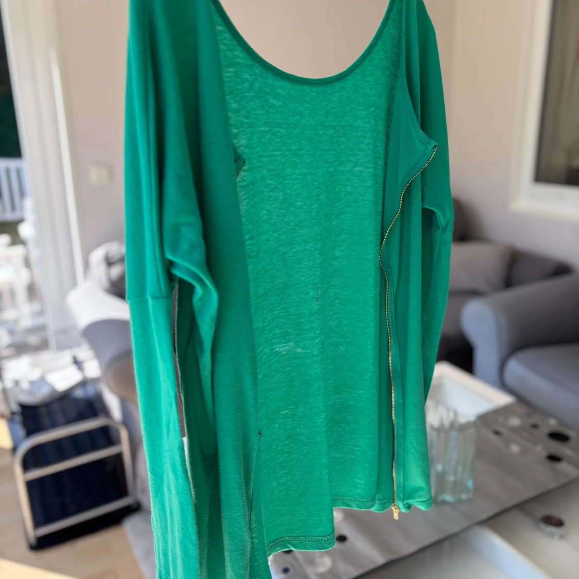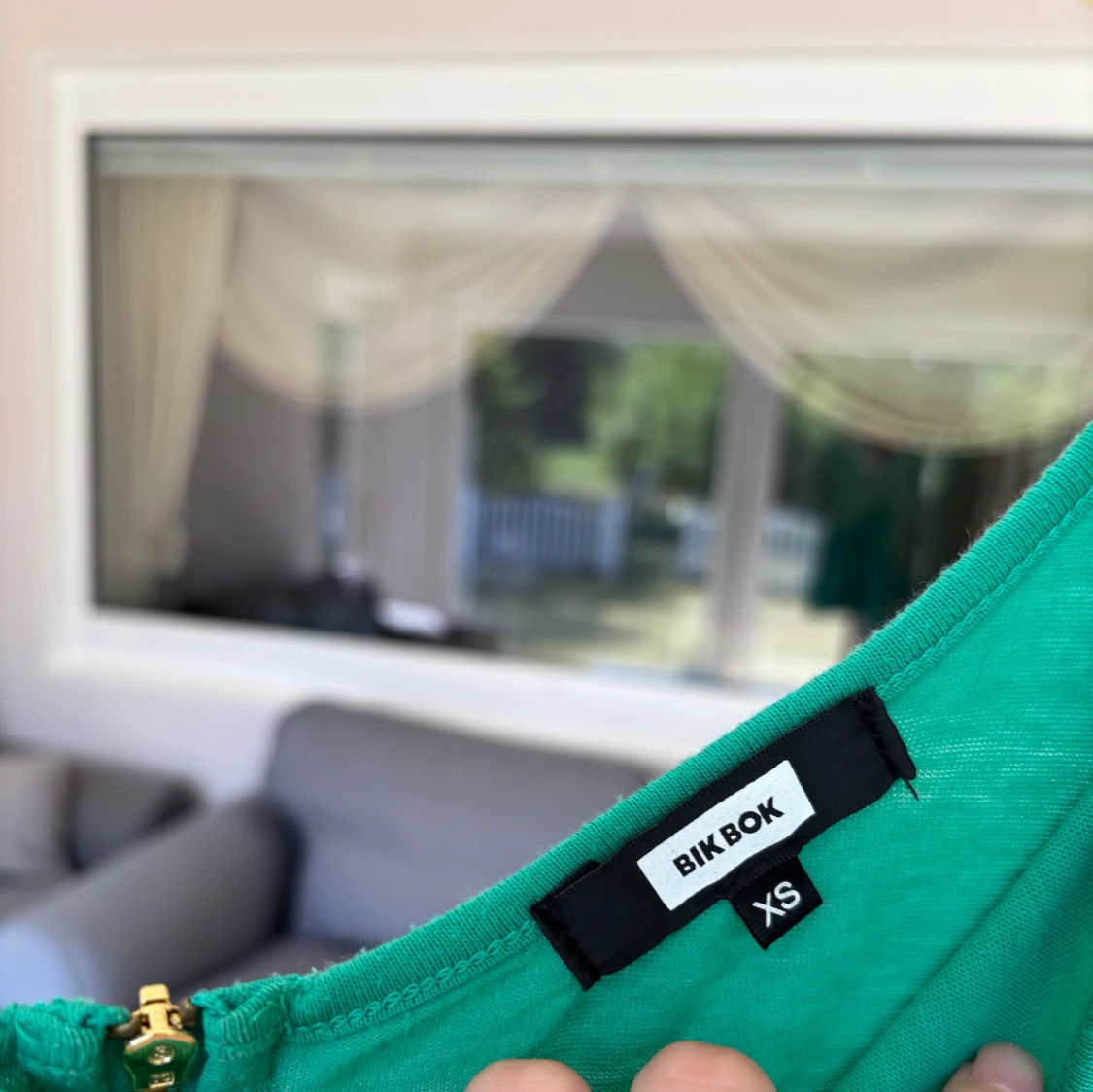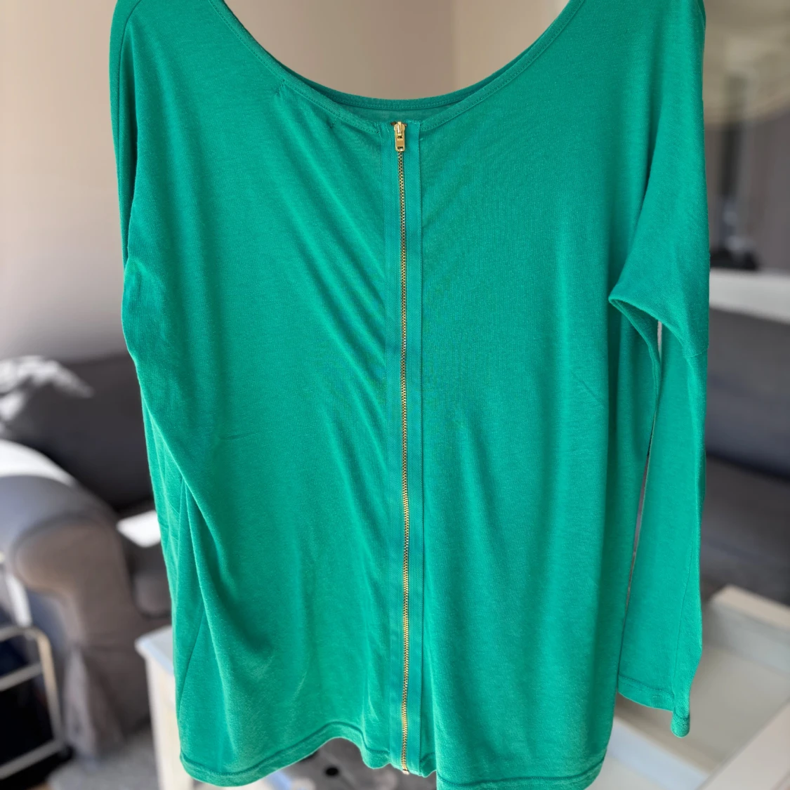Snygg grön långärmad tröja från Bik Bok i storlek XS. Tröjan har en rundad halsringning och en guldig dragkedja längs ryggen som cool detalj. Tillverkad i mjuk bomull, perfekt för lager-på-lager eller som den är.