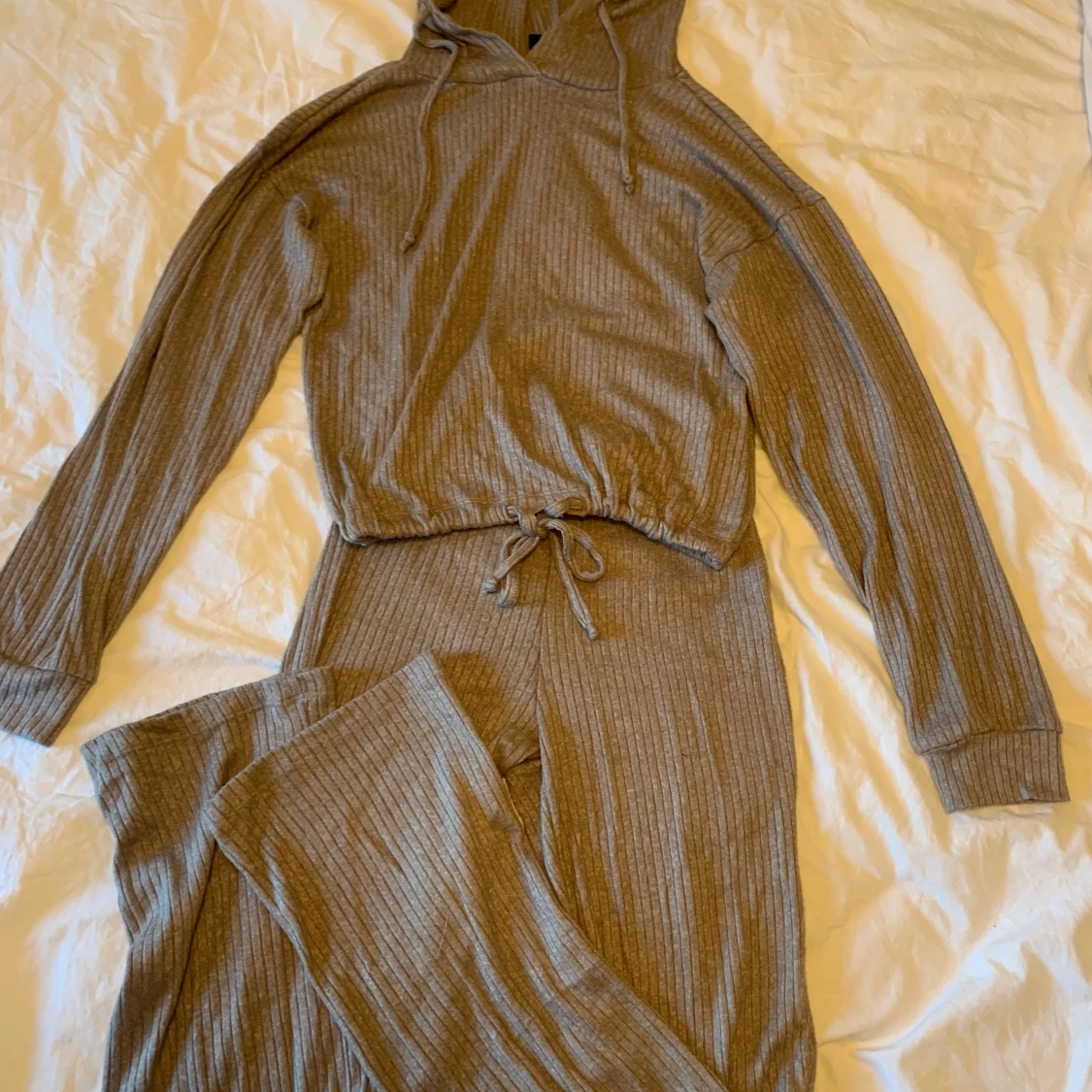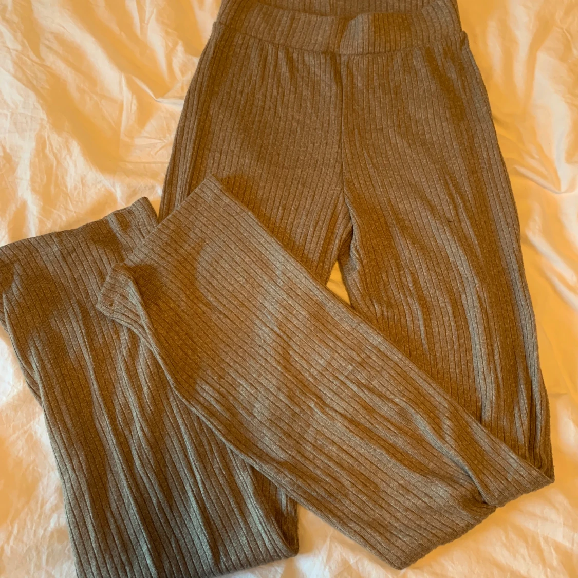 Ett brun beiget sett från bikbok byxorna i storlek xxs och tröja i storlek xs Tröjan har prislappen på