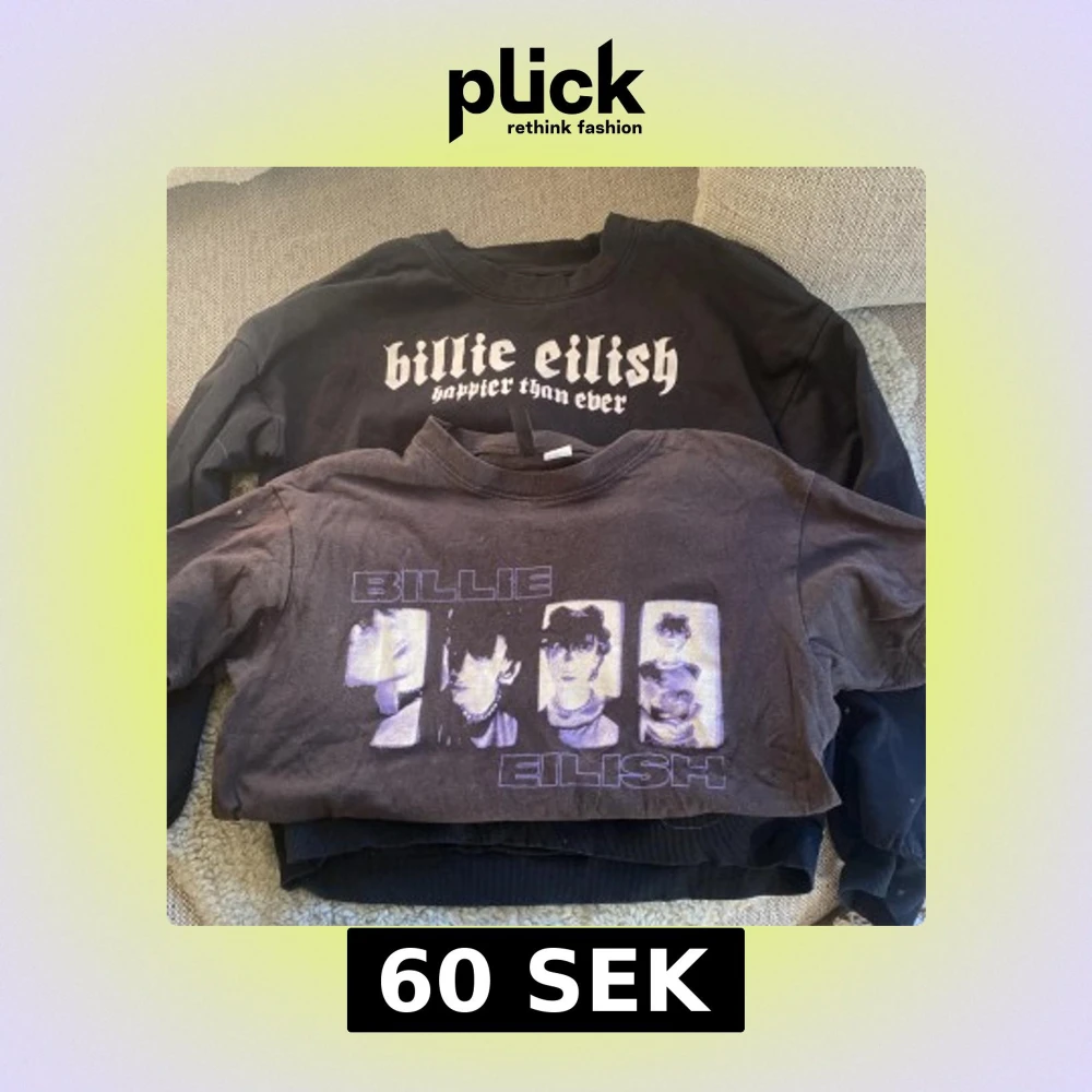 Två snygga tröjor med Billie Eilish-tryck. Den ena är svart sweatshirt med 'happier than ever' och stor vit bild på Billie, storlek 170 från Cubus. Den andra är en mörk t-shirt från H&M Divided i XS med lila och vit grafik av Billie Eilish. Perfekt för fans som vill sticka ut.