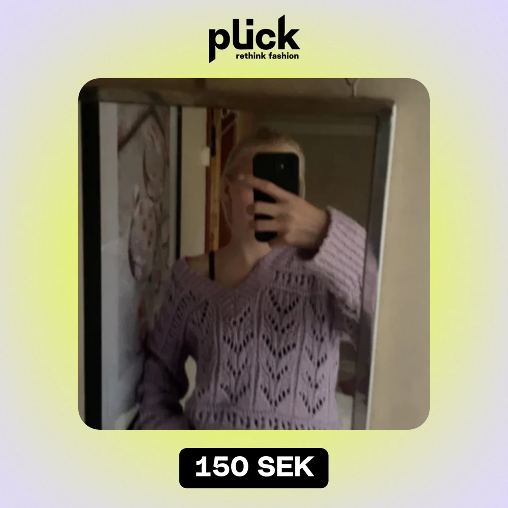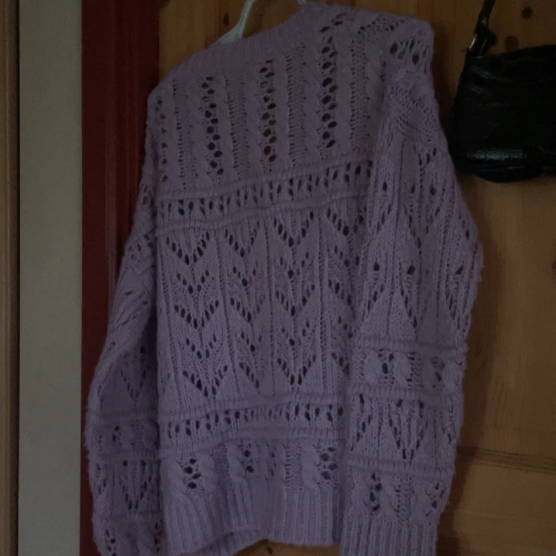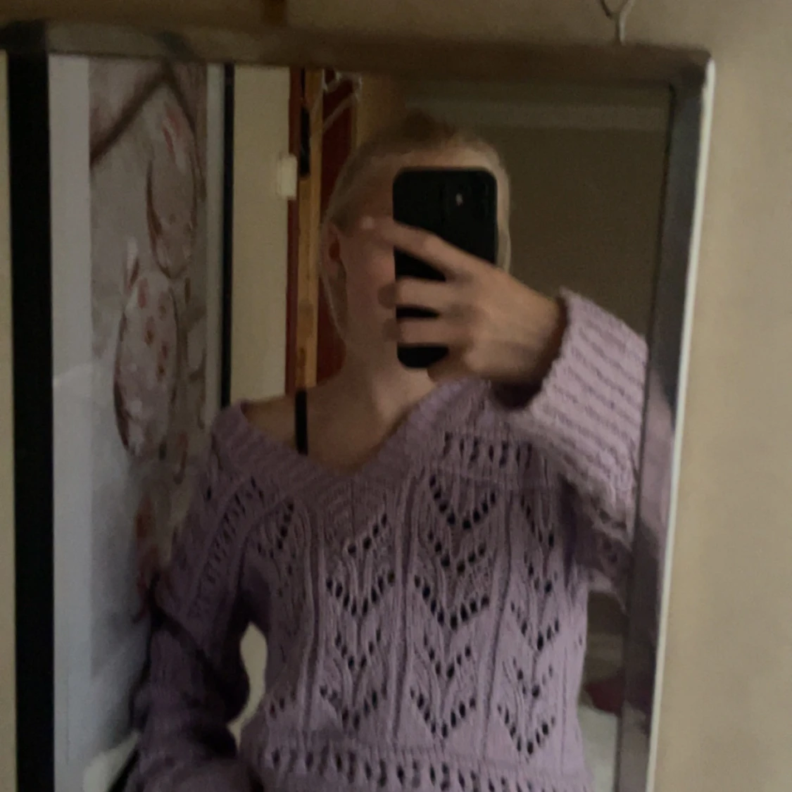 Säljer en superfin lila stickad tröja med ett snyggt hålmönster. Den har en v-ringad hals och långa ärmar, perfekt för höst och vinter! använt ca 3 ggr så inte jätte nopprig!
