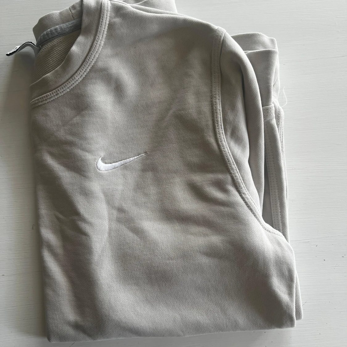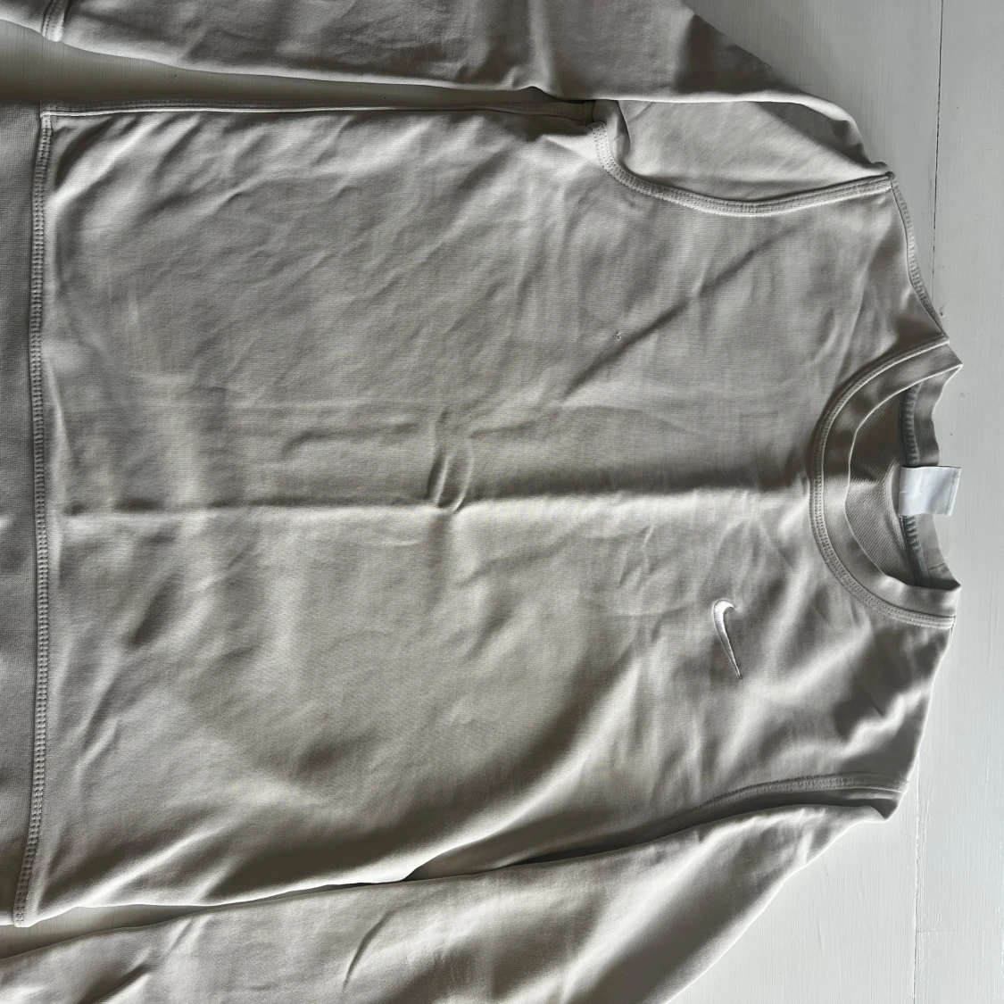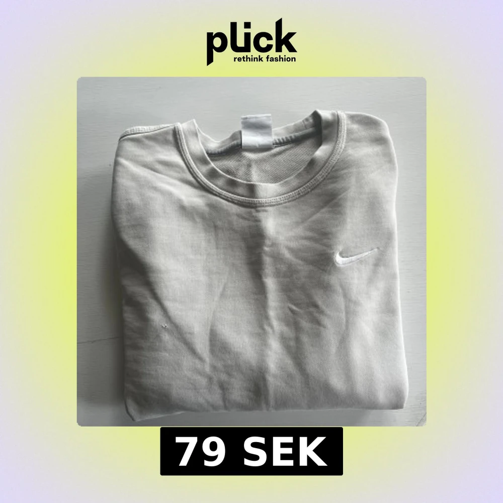 Säljer en ljusgrå sweatshirt från Nike med klassisk rund hals och broderad vit logga på bröstet. Tröjan är i mjuk bomull och har en enkel, stilren design som passar till det mesta. 7/10 i skick pga ett litet litet hål (se bild 4) Passar både S och lite mindre M.