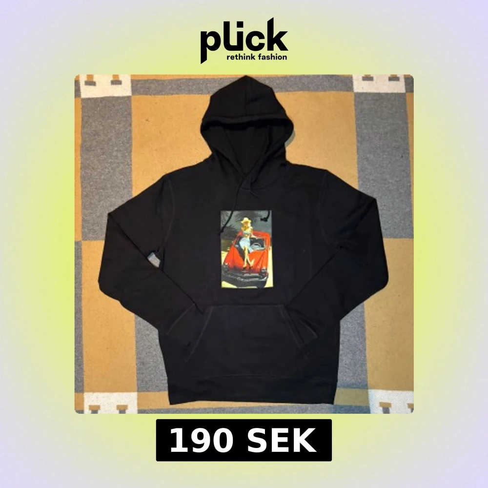 Säljer en svart hoodie med en färgglad tryckt bild framtill som föreställer en person vid en röd bil. Klassisk huva och känguruficka. Perfekt för en avslappnad stil. Helt ny✅. Storlek: L finns olika storlekar. Rabatt om man följer