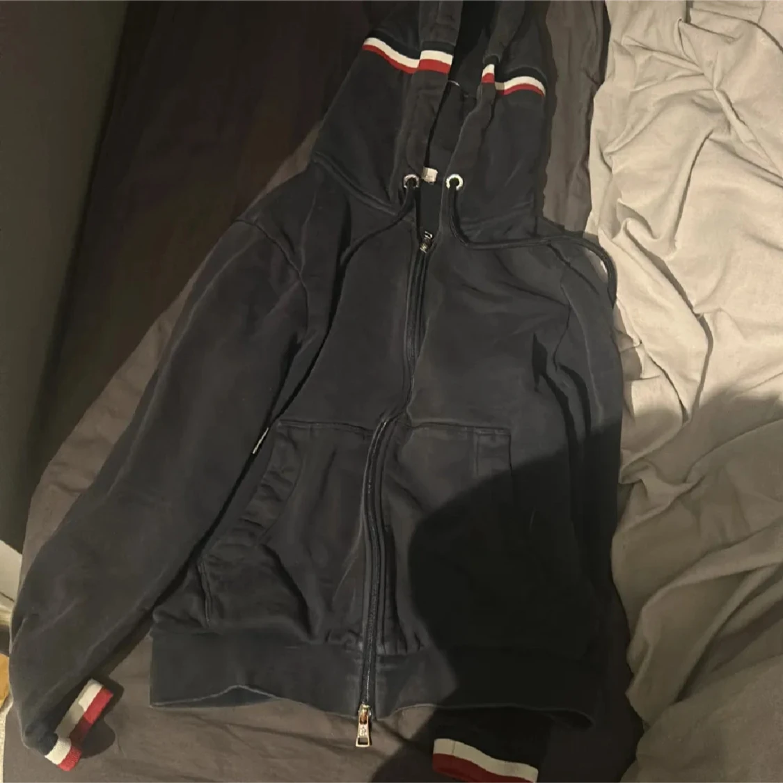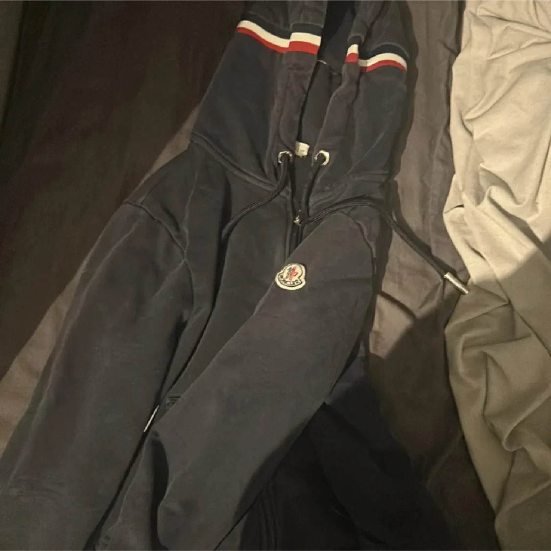 Säljer min moncler kofta för den är för liten, logan sitter lite löst men syns ej när man har på sig den, lite solblekt. storlek S
