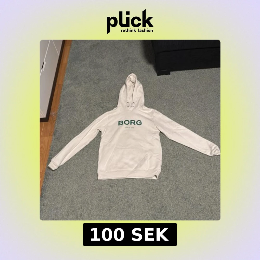 Säljer en stilren vit hoodie från Björn Borg med texten 'BORG SINCE 1956' i grönt på bröstet. Tröjan har en klassisk känguruficka och justerbar huva med snören. Perfekt för en avslappnad stil.