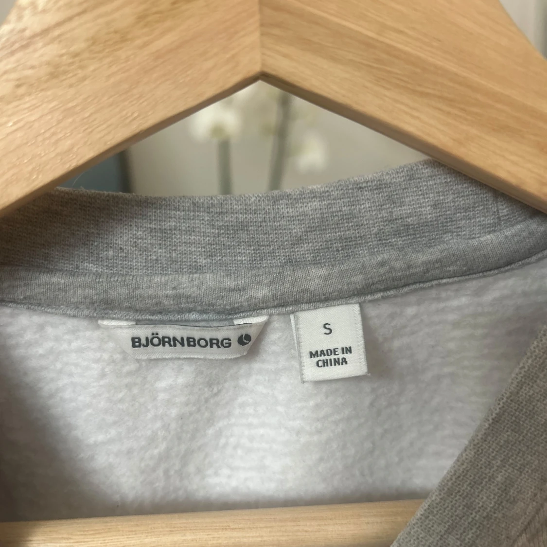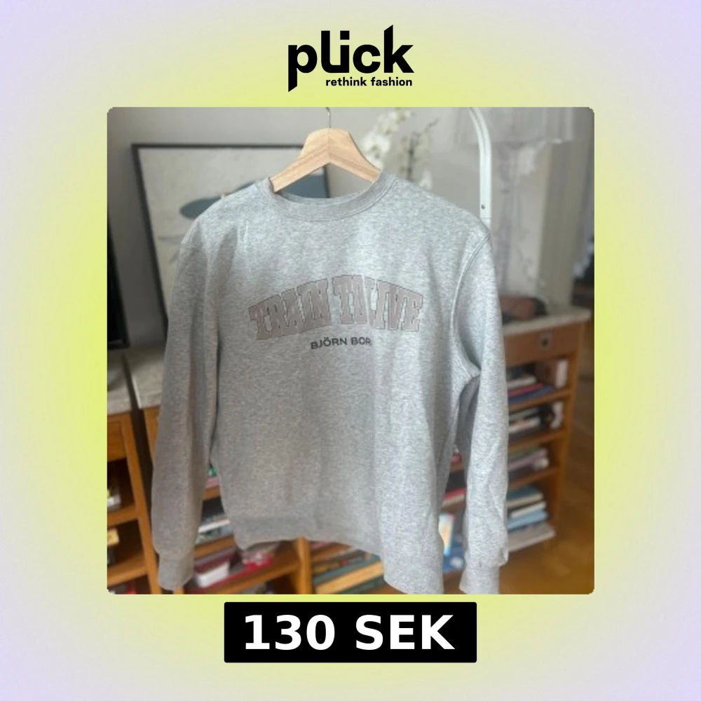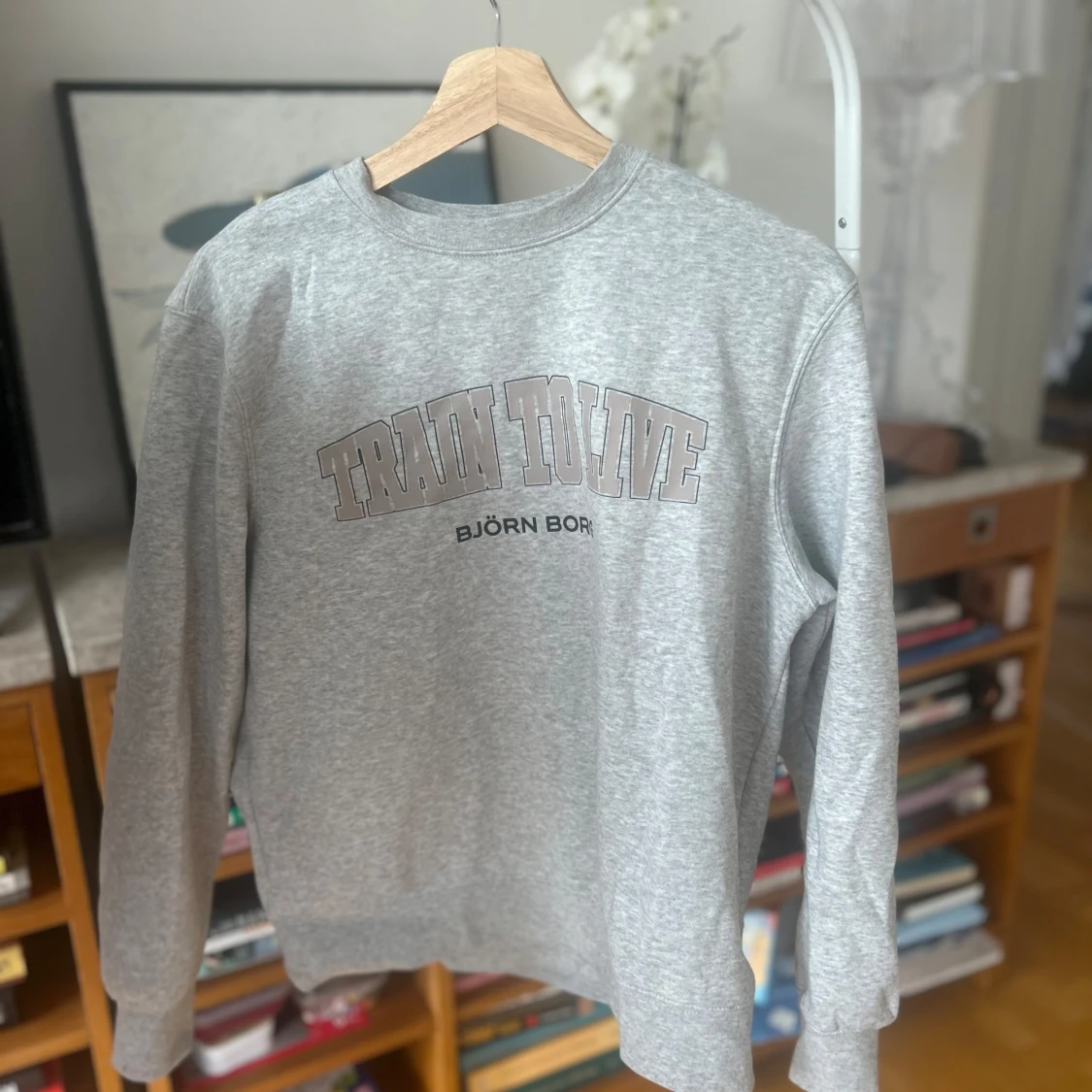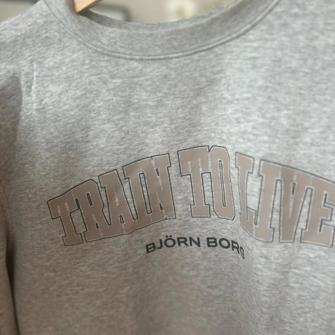 Säljer en grå sweatshirt från Björn Borg med texten 'Train to Live' tryckt på framsidan. Tröjan har långa ärmar och en klassisk rund halsringning. Perfekt för en avslappnad stil.
