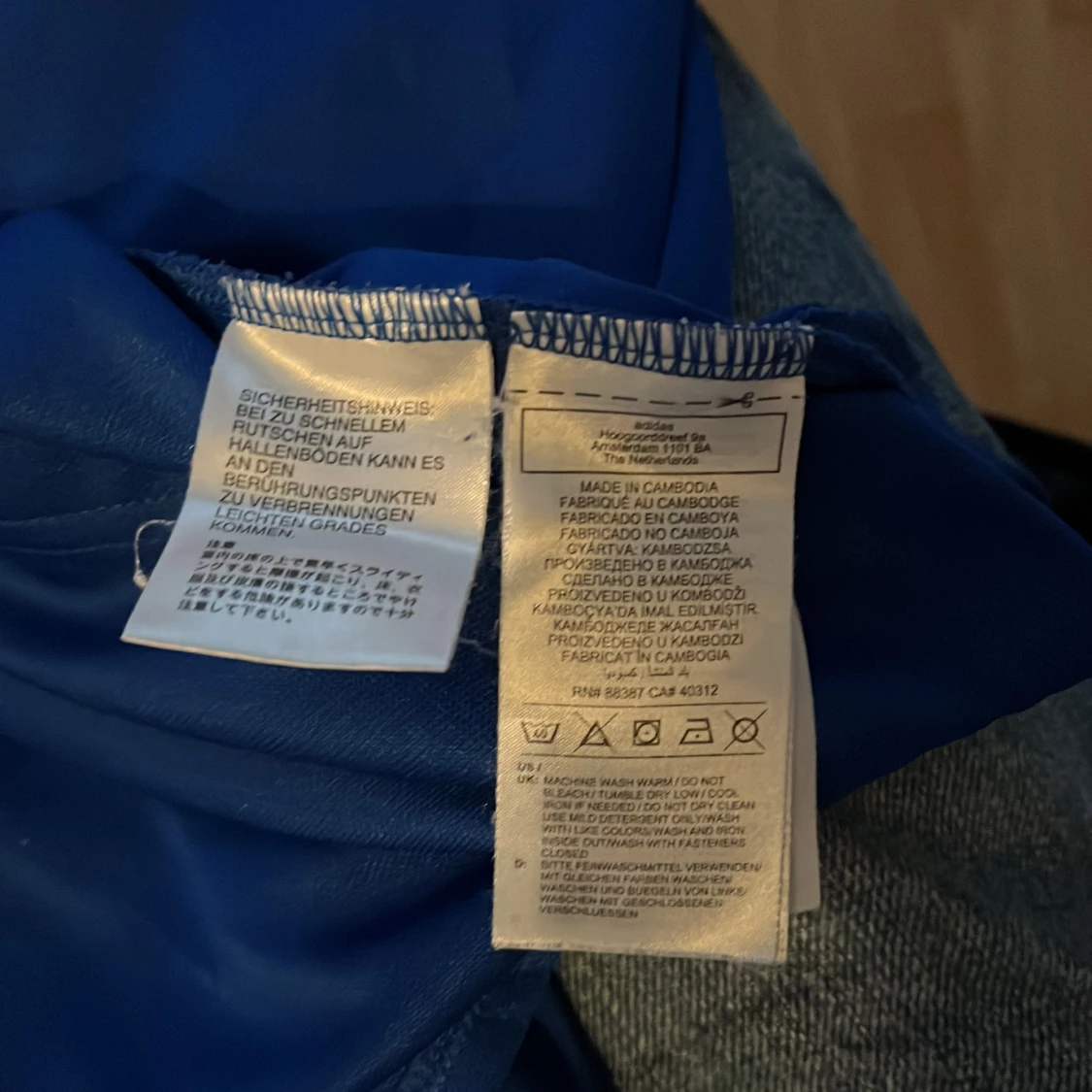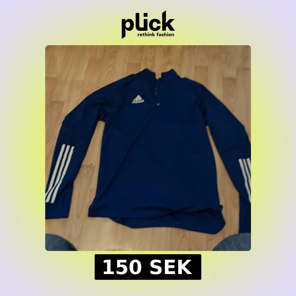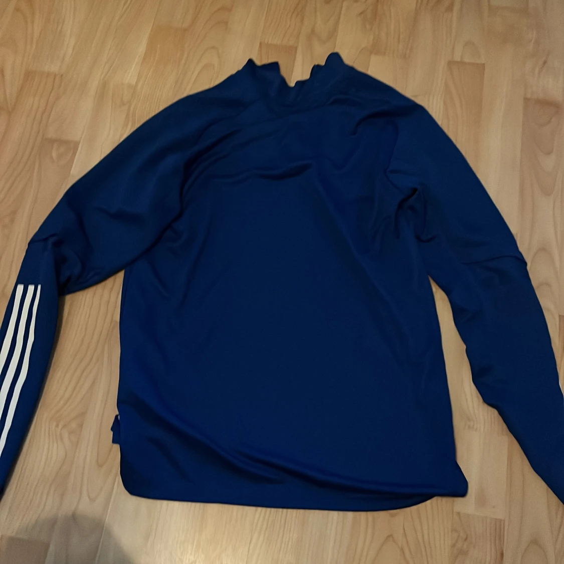 Blå långärmad träningströja från Adidas med klassiska vita ränder på ärmarna och Adidas-logga på bröstet. Tröjan har half zip framtill och är tillverkad i polyester, perfekt för sport eller chill. Snygg och sportig look!
