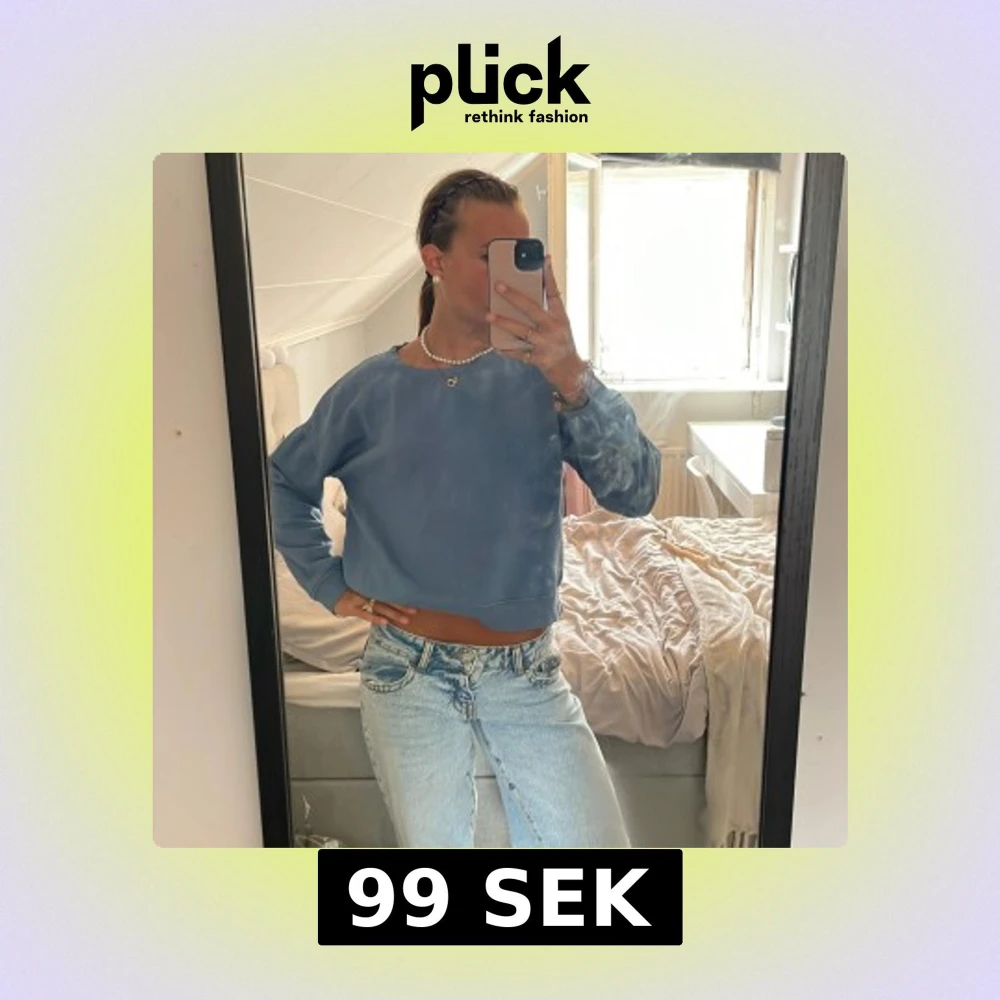 Säljer en stilren blå croppad sweatshirt med rund hals och ribbade muddar vid ärmslut och halsringning. Tröjan har en loose passform och är långärmad, perfekt för chill dagar. Materialet känns som mjuk bomull och färgen är en snygg ljusblå ton. Storlek är M men liten i storleken så den sitter som en xs/S