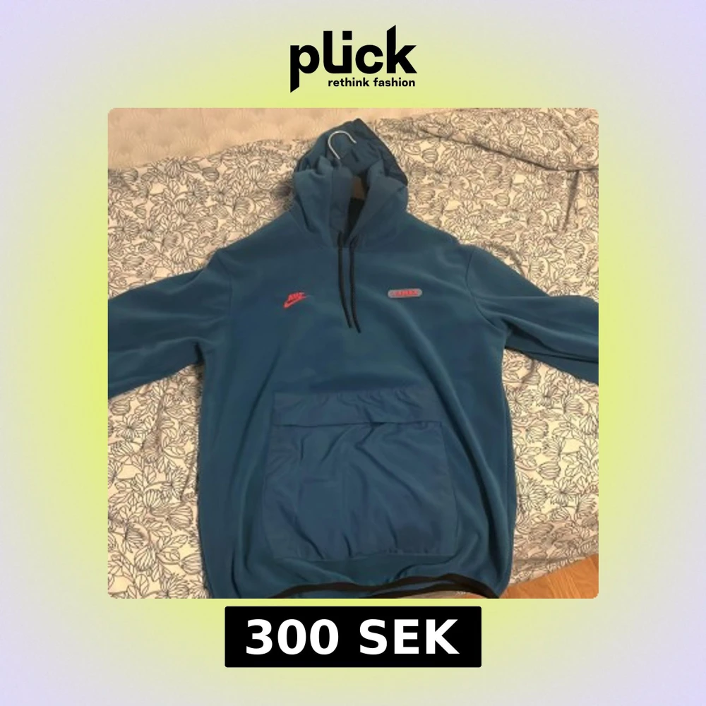 Säljer en blå hoodie från Nike Air Max med broderad logga och Air Max-märke på bröstet. Tröjan har huva med dragsko och stor magficka framtill. Tillverkad i mjuk fleece, perfekt för kyliga dagar.